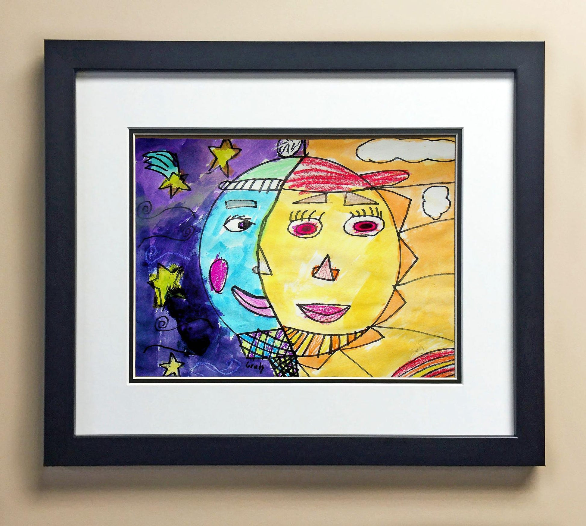 Included with the purchase is the Students Artwork, Frame, double matboard, shatter proof plexiglass, and a ready to hang backerboard with turnbuttons