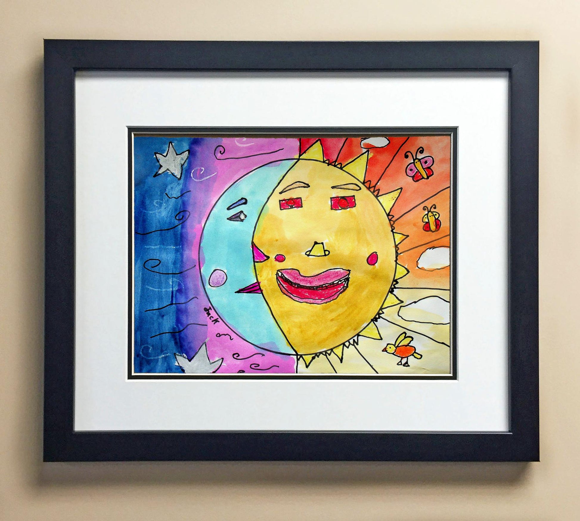 Included with the purchase is the Students Artwork, Frame, double matboard, shatter proof plexiglass, and a ready to hang backerboard with turnbuttons