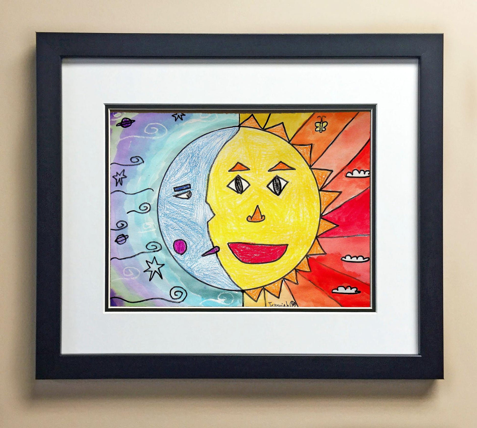 Included with the purchase is the Students Artwork, Frame, double matboard, shatter proof plexiglass, and a ready to hang backerboard with turnbuttons