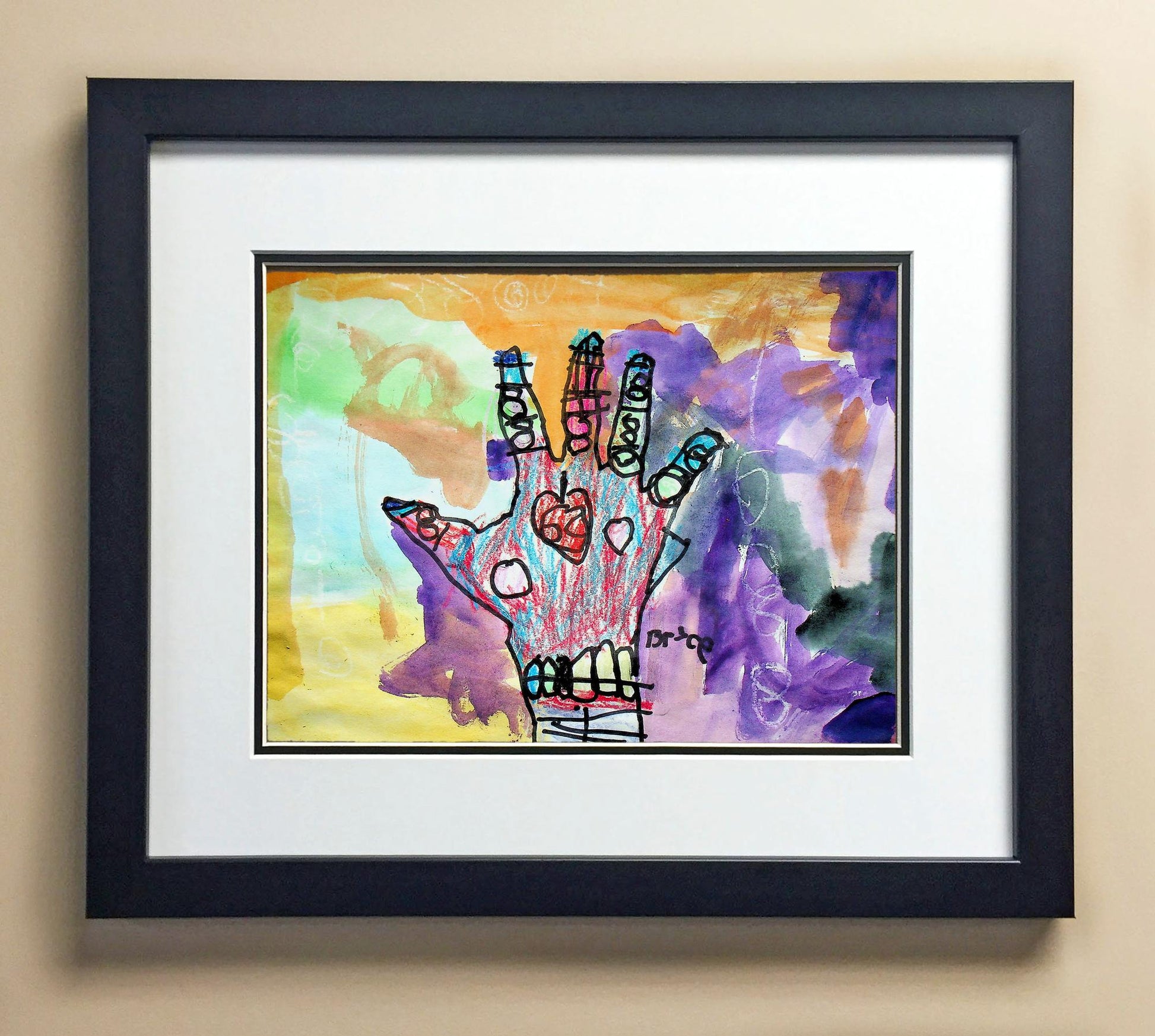 Included with the purchase is the Students Artwork, Frame, double matboard, shatter proof plexiglass, and a ready to hang backerboard with turnbuttons