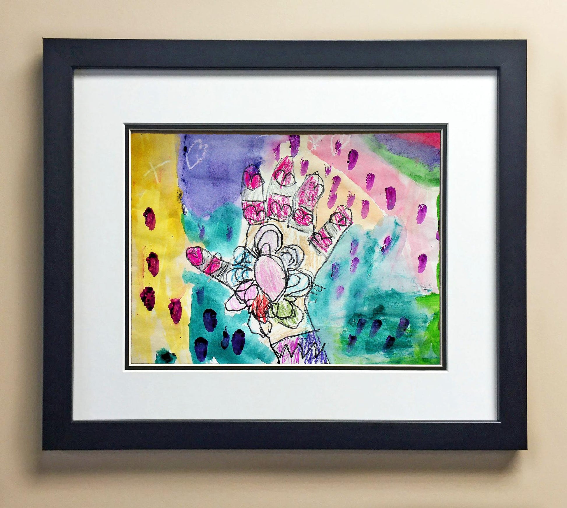 Included with the purchase is the Students Artwork, Frame, double matboard, shatter proof plexiglass, and a ready to hang backerboard with turnbuttons