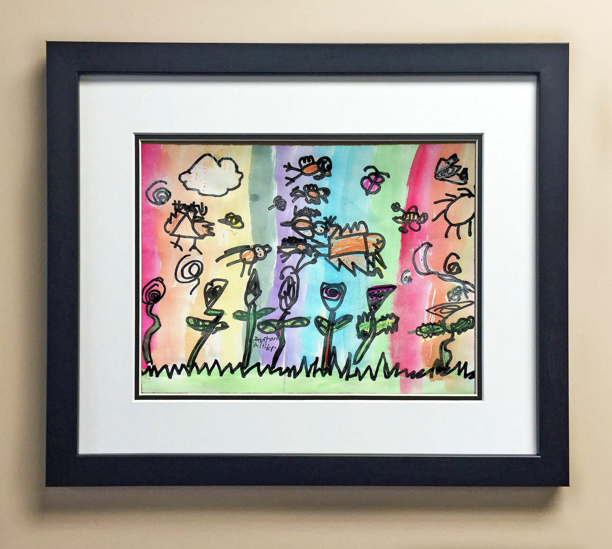 Included with the purchase is the Students Artwork, Frame, double matboard, shatter proof plexiglass, and a ready to hang backerboard with turnbuttons
