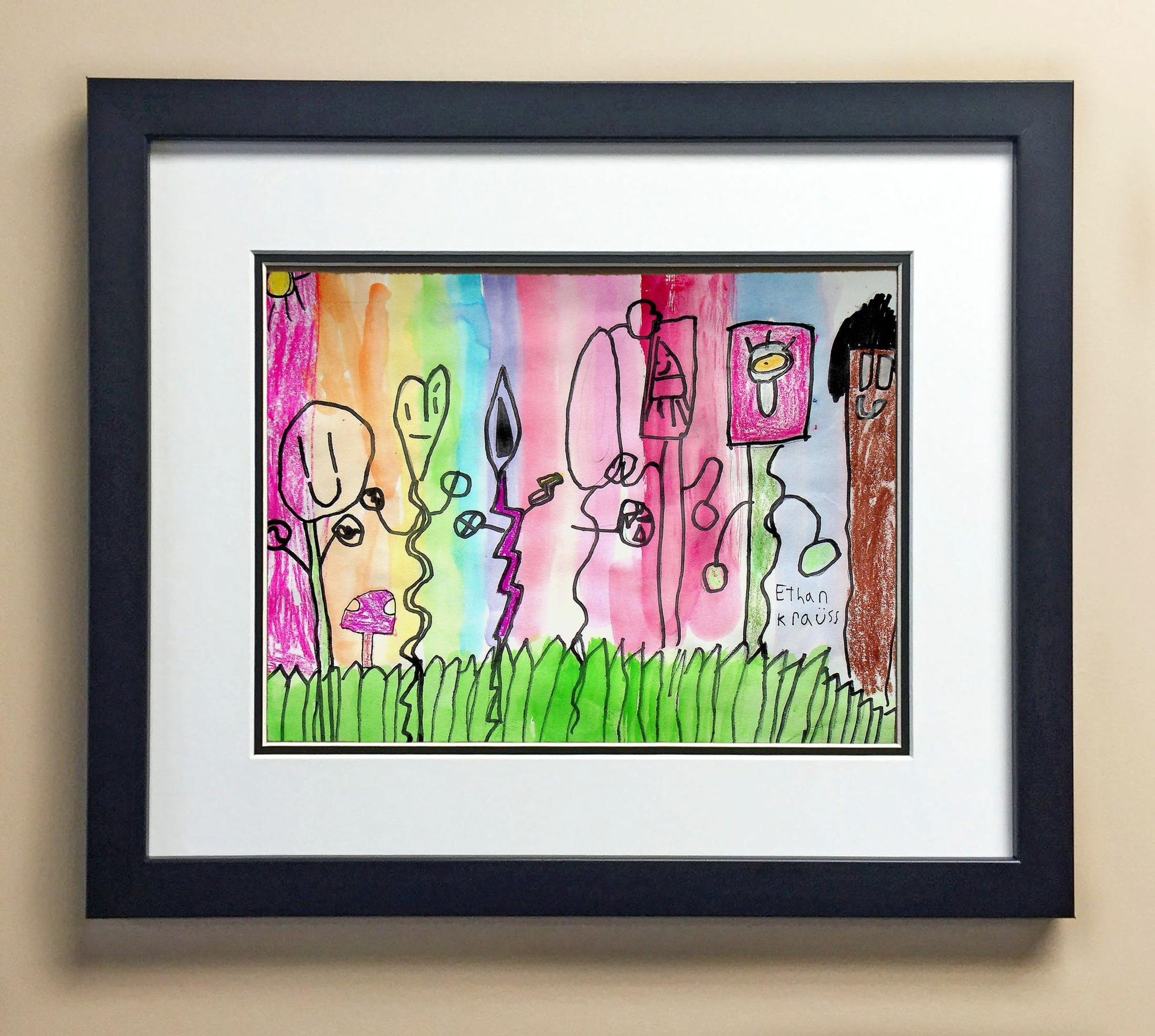 Included with the purchase is the Students Artwork, Frame, double matboard, shatter proof plexiglass, and a ready to hang backerboard with turnbuttons