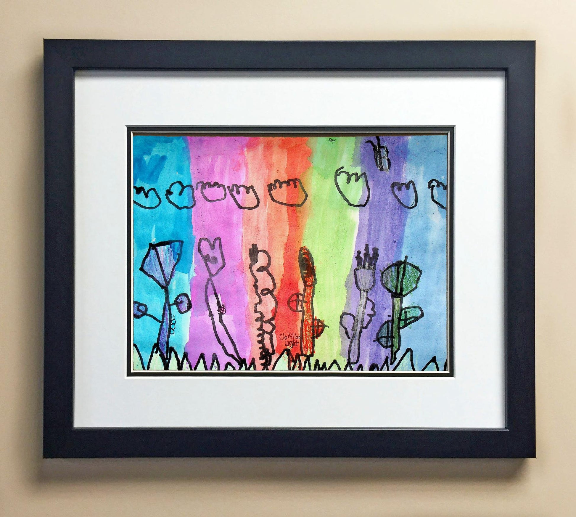 Included with the purchase is the Students Artwork, Frame, double matboard, shatter proof plexiglass, and a ready to hang backerboard with turnbuttons