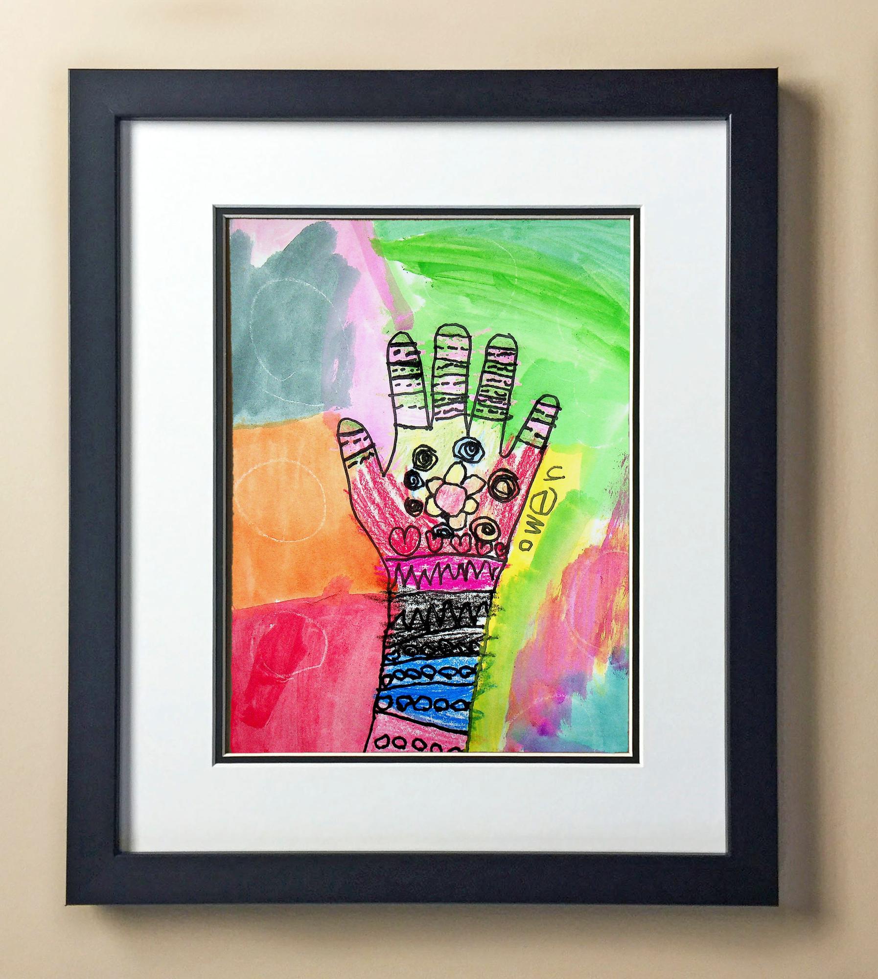 Included with the purchase is the Students Artwork, Frame, double matboard, shatter proof plexiglass, and a ready to hang backerboard with turnbuttons