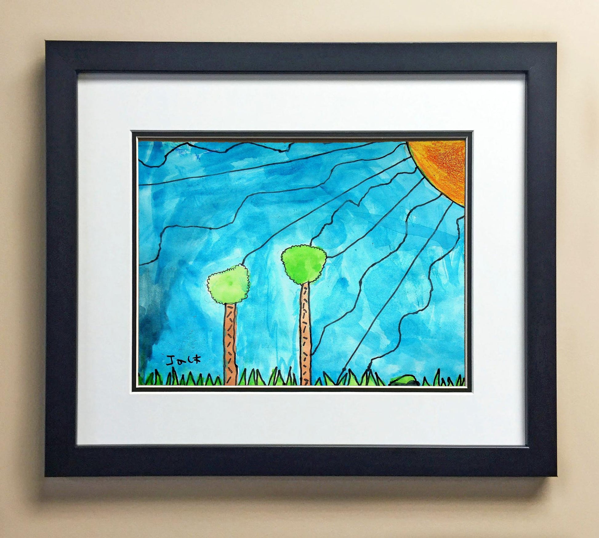 Included with the purchase is the Students Artwork, Frame, double matboard, shatter proof plexiglass, and a ready to hang backerboard with turnbuttons