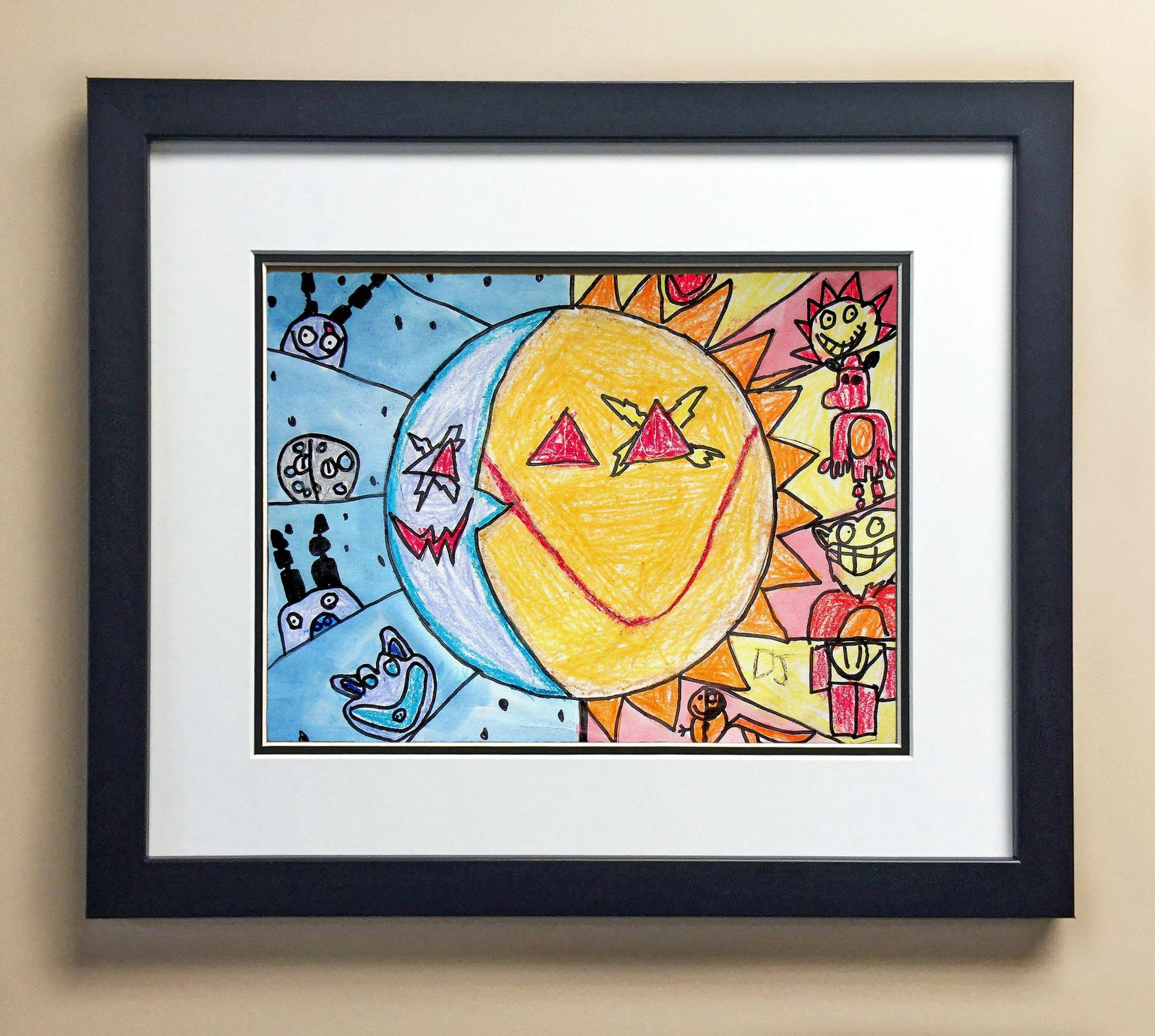 Included with the purchase is the Students Artwork, Frame, double matboard, shatter proof plexiglass, and a ready to hang backerboard with turnbuttons