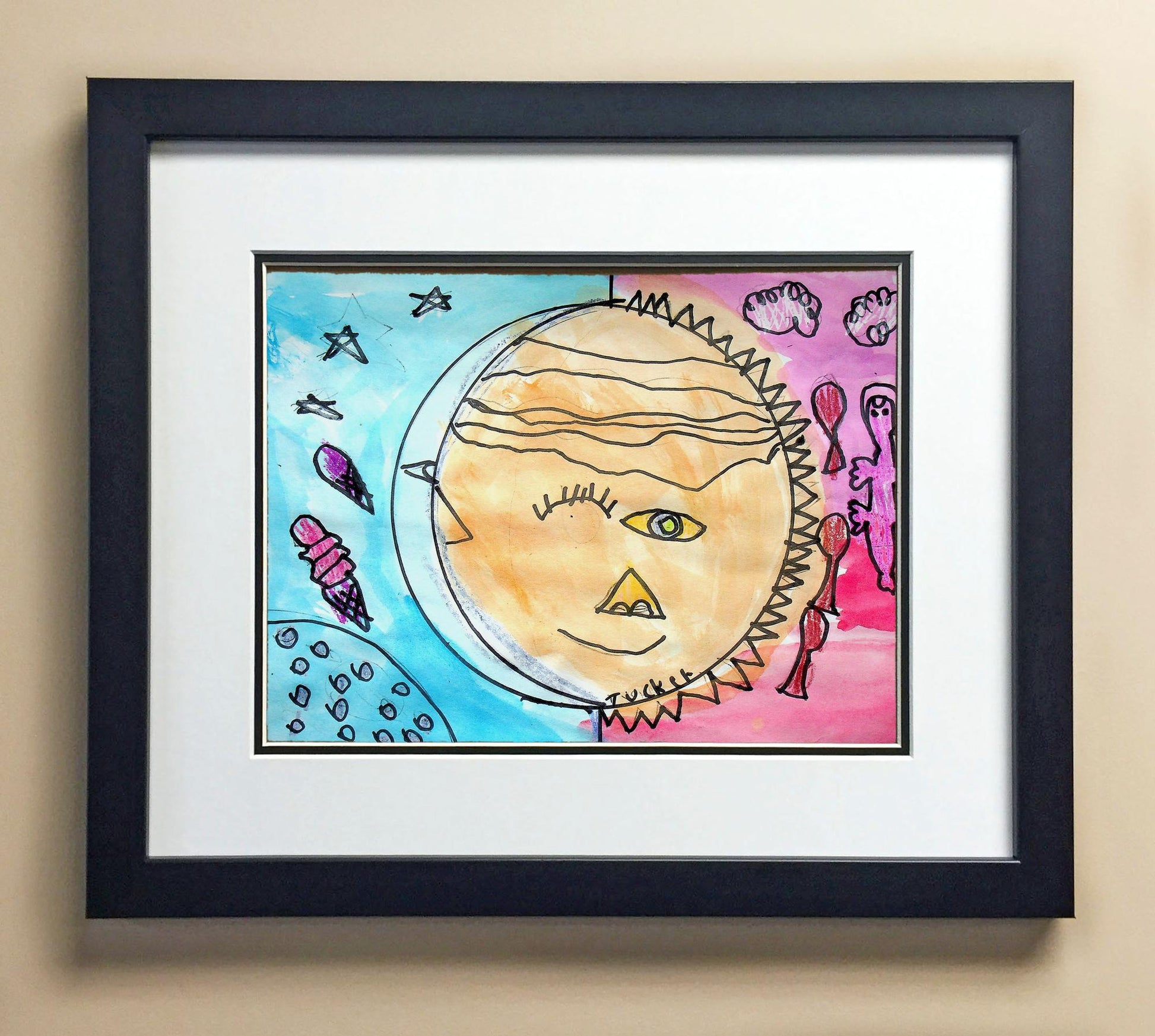 Included with the purchase is the Students Artwork, Frame, double matboard, shatter proof plexiglass, and a ready to hang backerboard with turnbuttons