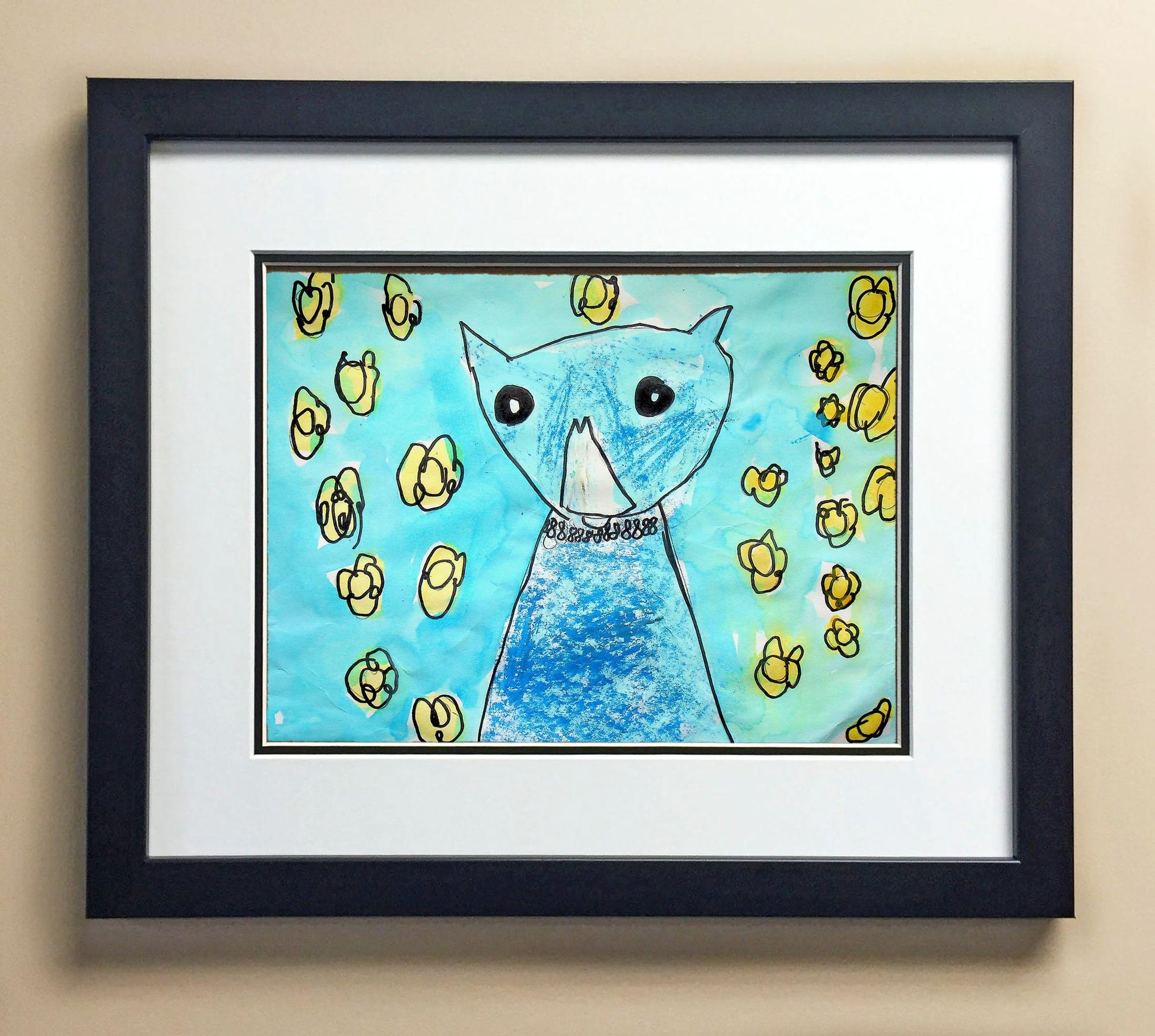 Included with the purchase is the Students Artwork, Frame, double matboard, shatter proof plexiglass, and a ready to hang backerboard with turnbuttons