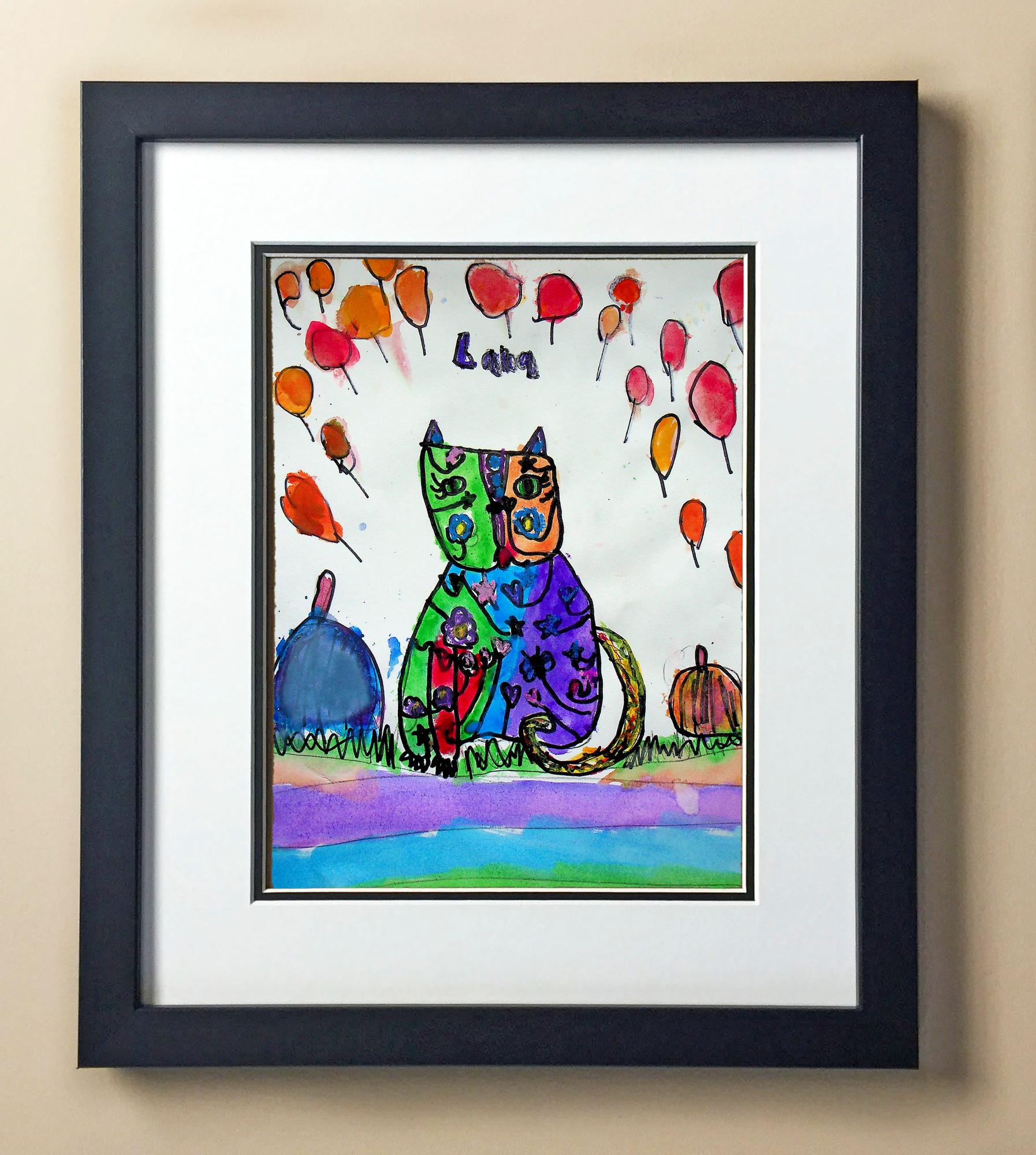 Included with the purchase is the Students Artwork, Frame, double matboard, shatter proof plexiglass, and a ready to hang backerboard with turnbuttons