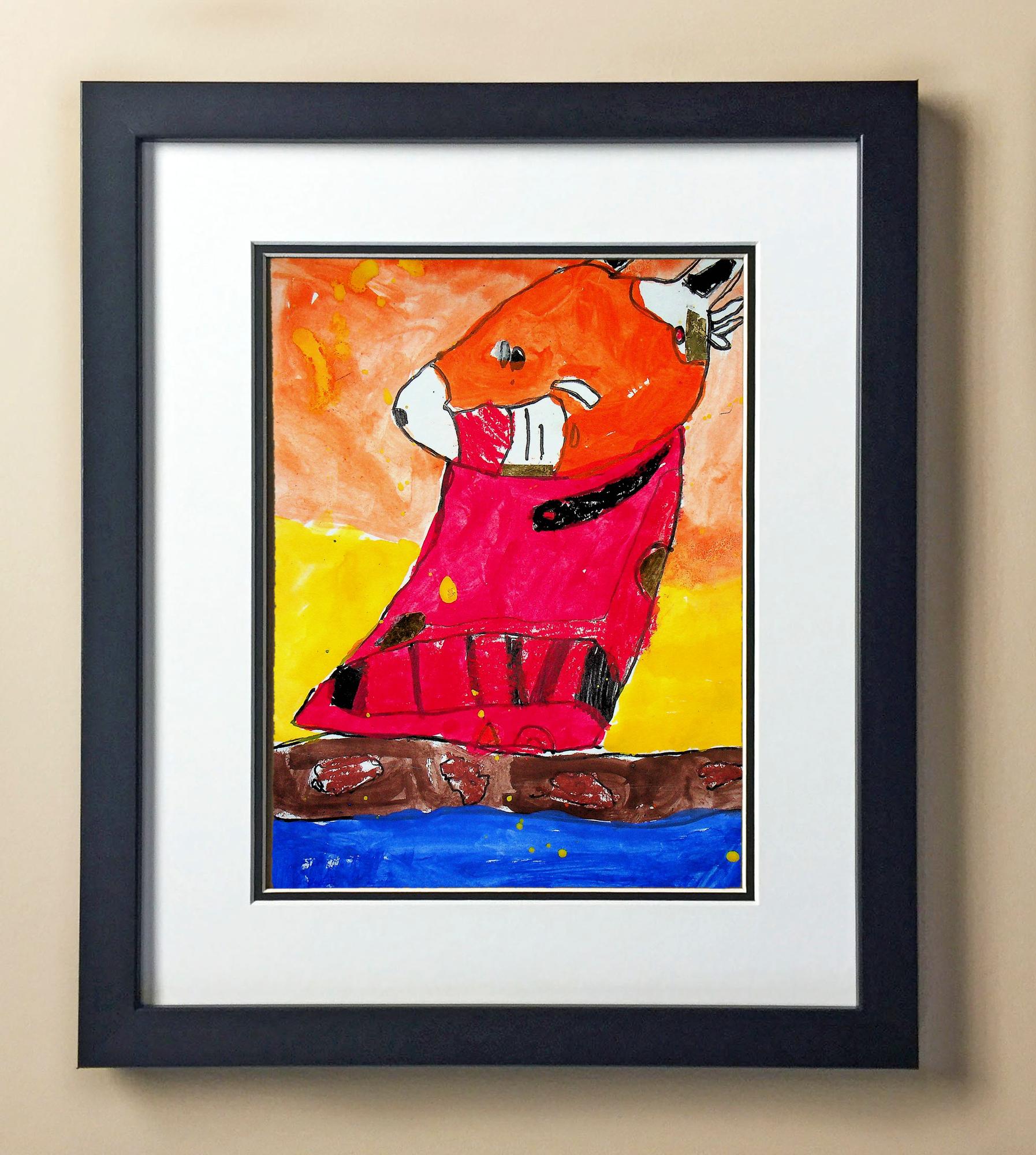 Included with the purchase is the Students Artwork, Frame, double matboard, shatter proof plexiglass, and a ready to hang backerboard with turnbuttons