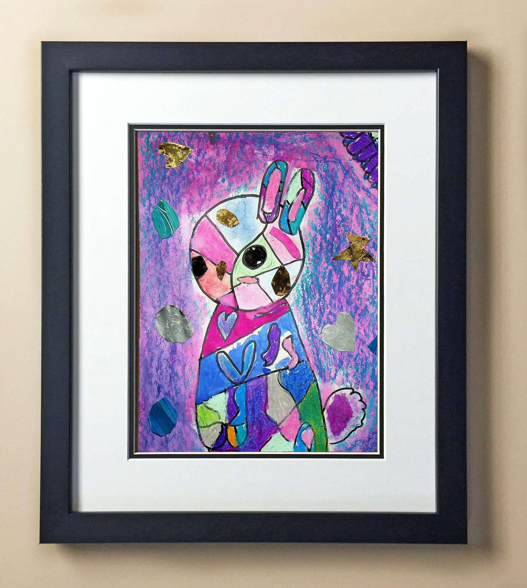 Included with the purchase is the Students Artwork, Frame, double matboard, shatter proof plexiglass, and a ready to hang backerboard with turnbuttons