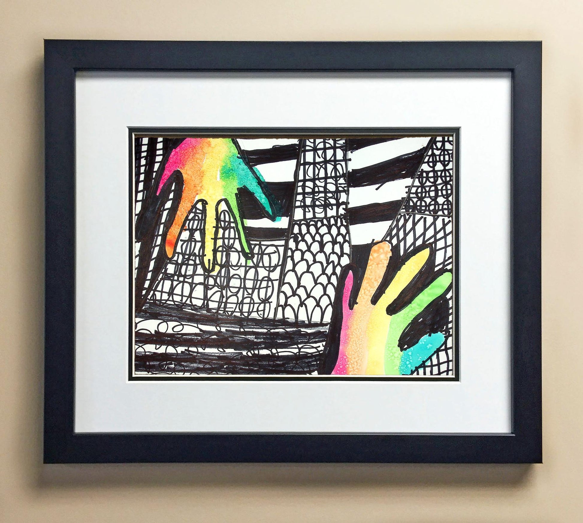 Included with the purchase is the Students Artwork, Frame, double matboard, shatter proof plexiglass, and a ready to hang backerboard with turnbuttons