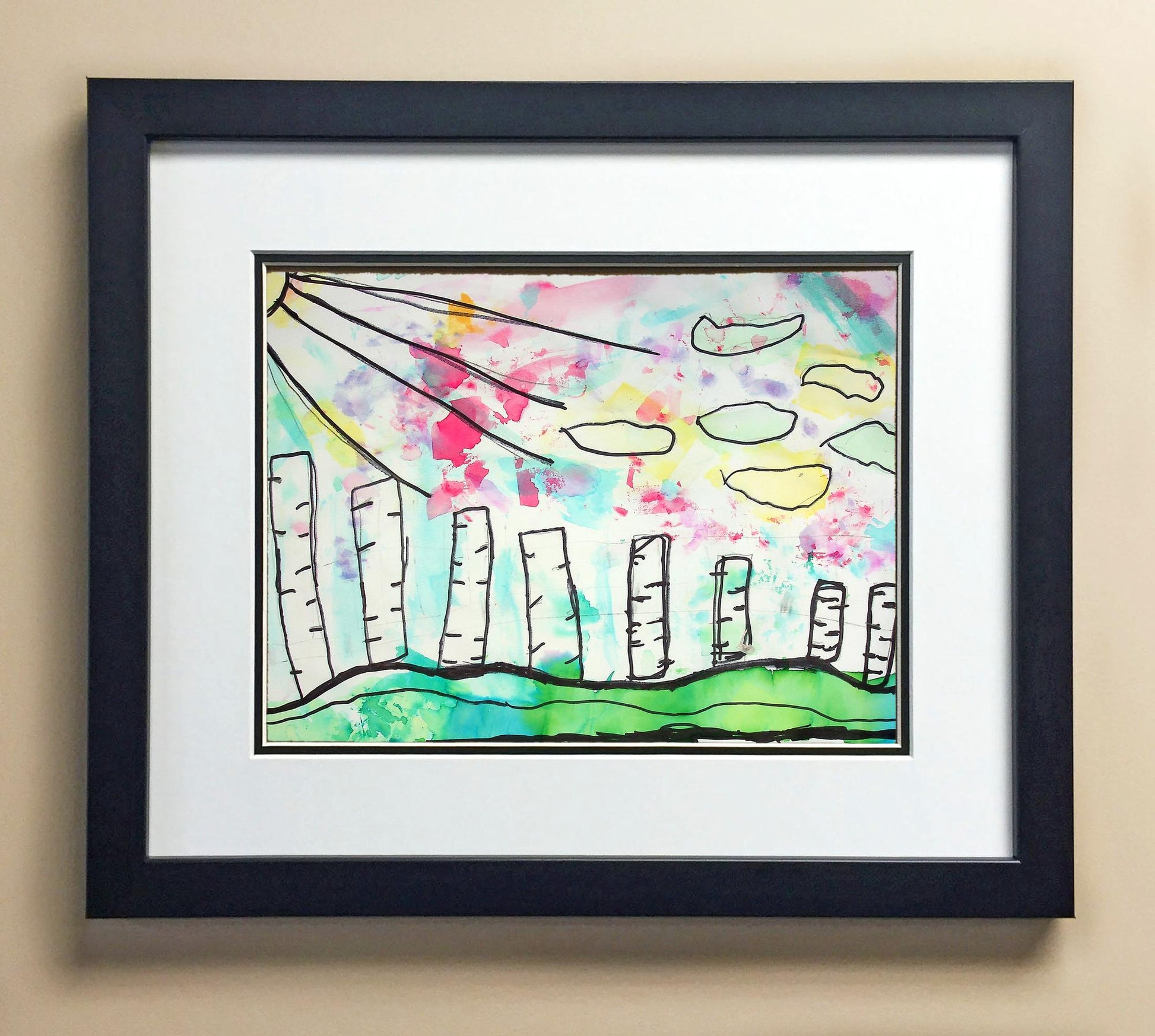 Included with the purchase is the Students Artwork, Frame, double matboard, shatter proof plexiglass, and a ready to hang backerboard with turnbuttons