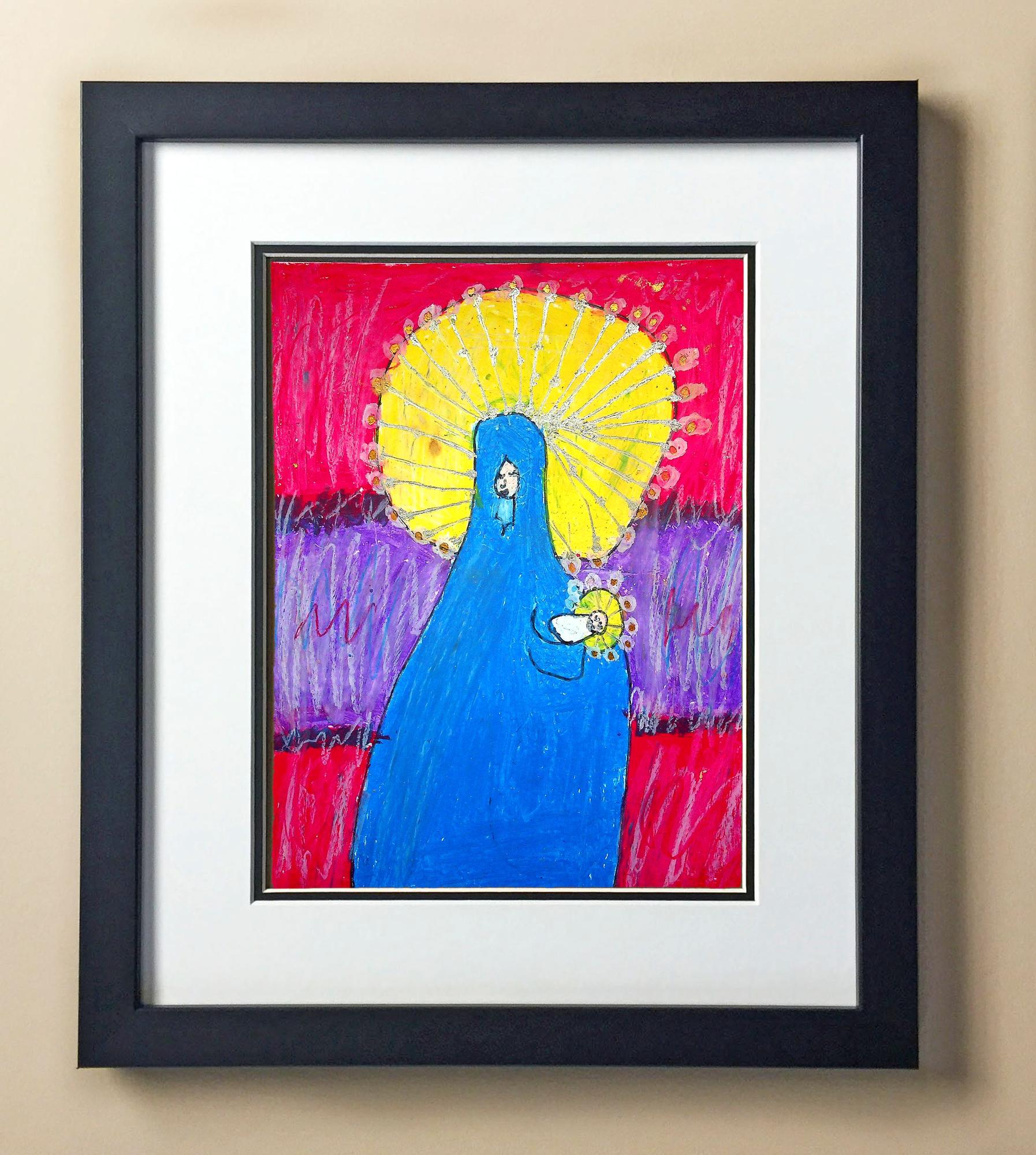 Included with the purchase is the Students Artwork, Frame, double matboard, shatter proof plexiglass, and a ready to hang backerboard with turnbuttons