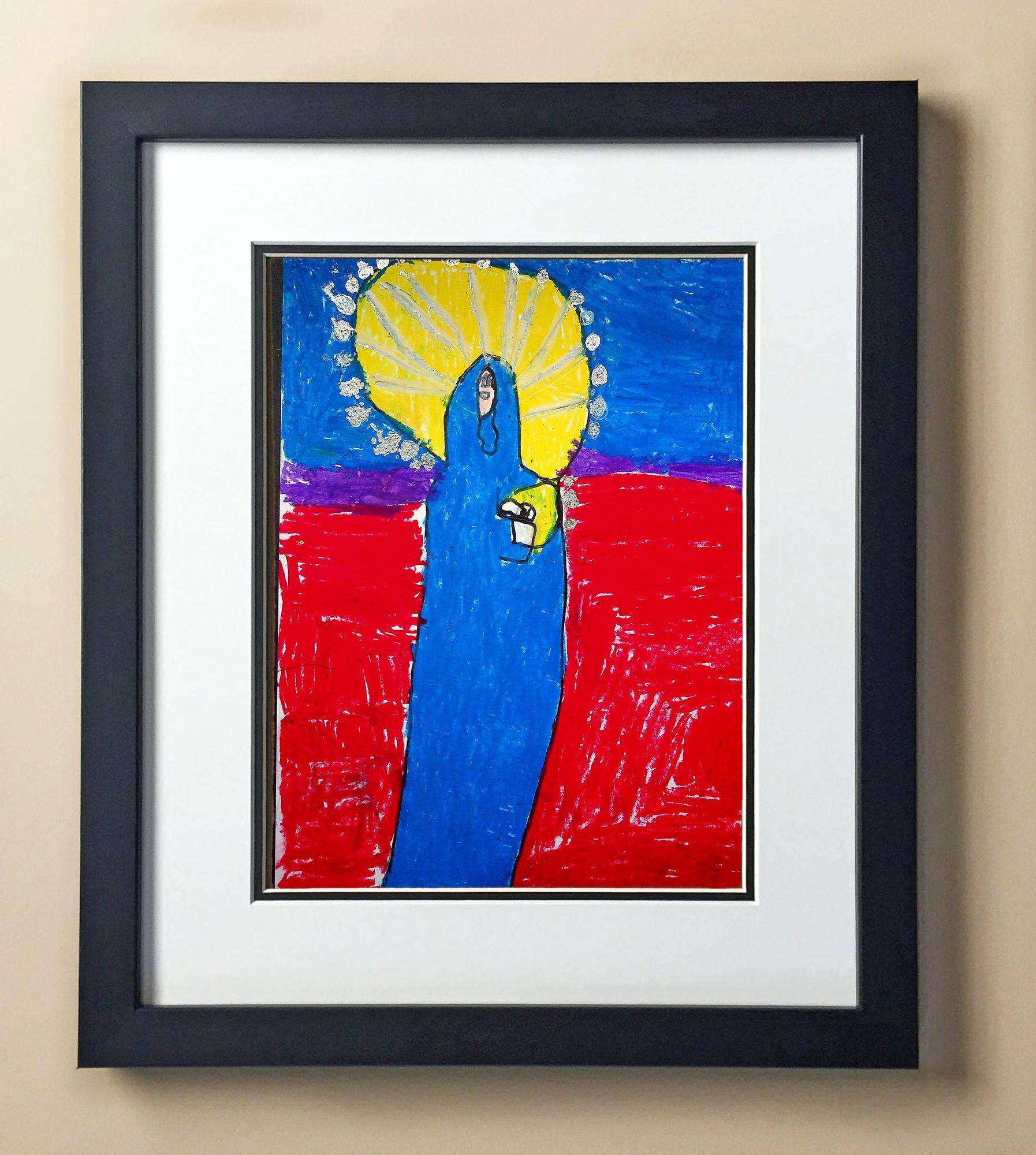 Included with the purchase is the Students Artwork, Frame, double matboard, shatter proof plexiglass, and a ready to hang backerboard with turnbuttons