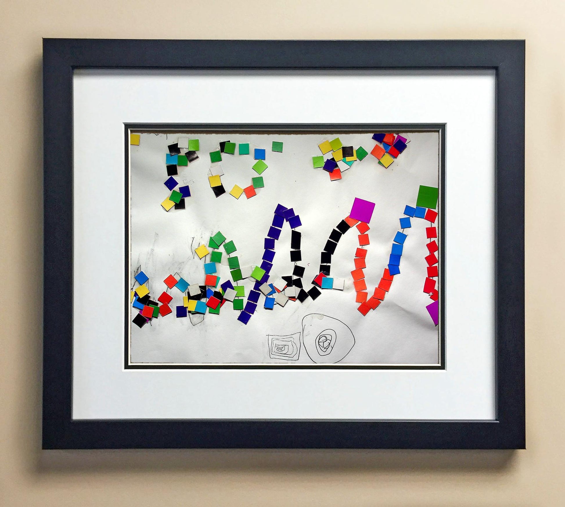 Included with the purchase is the Students Artwork, Frame, double matboard, shatter proof plexiglass, and a ready to hang backerboard with turnbuttons