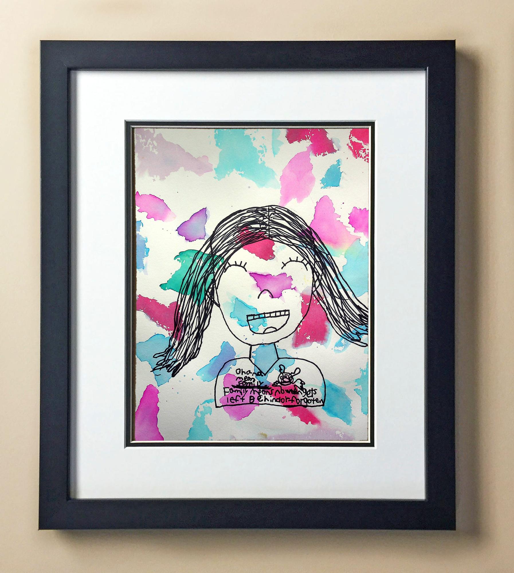 Included with the purchase is the Students Artwork, Frame, double matboard, shatter proof plexiglass, and a ready to hang backerboard with turnbuttons