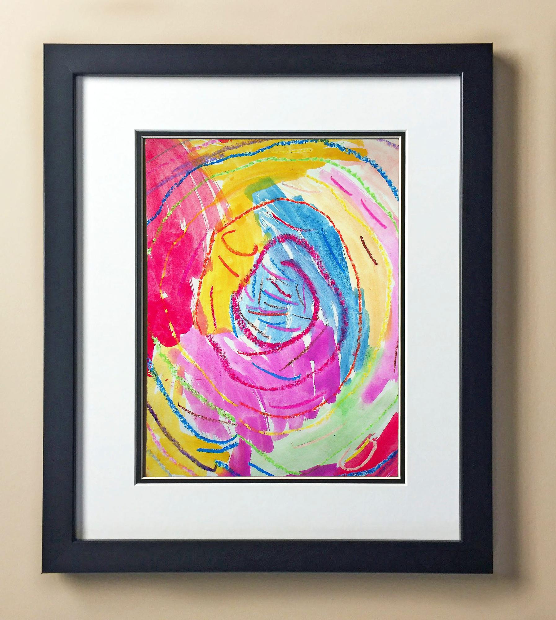 Included with the purchase is the Students Artwork, Frame, double matboard, shatter proof plexiglass, and a ready to hang backerboard with turnbuttons
