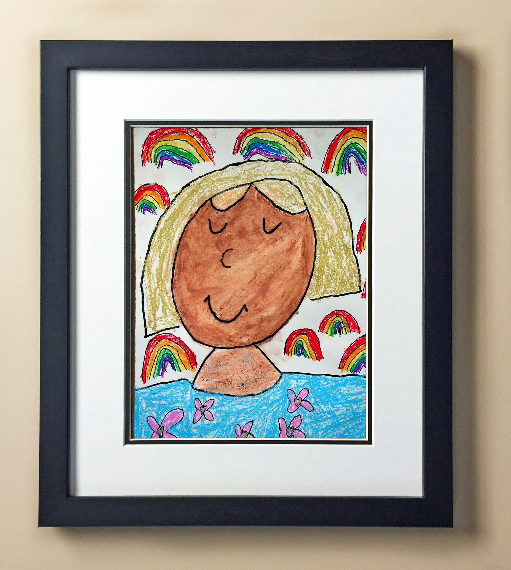 Included with the purchase is the Students Artwork, Frame, double matboard, shatter proof plexiglass, and a ready to hang backerboard with turnbuttons