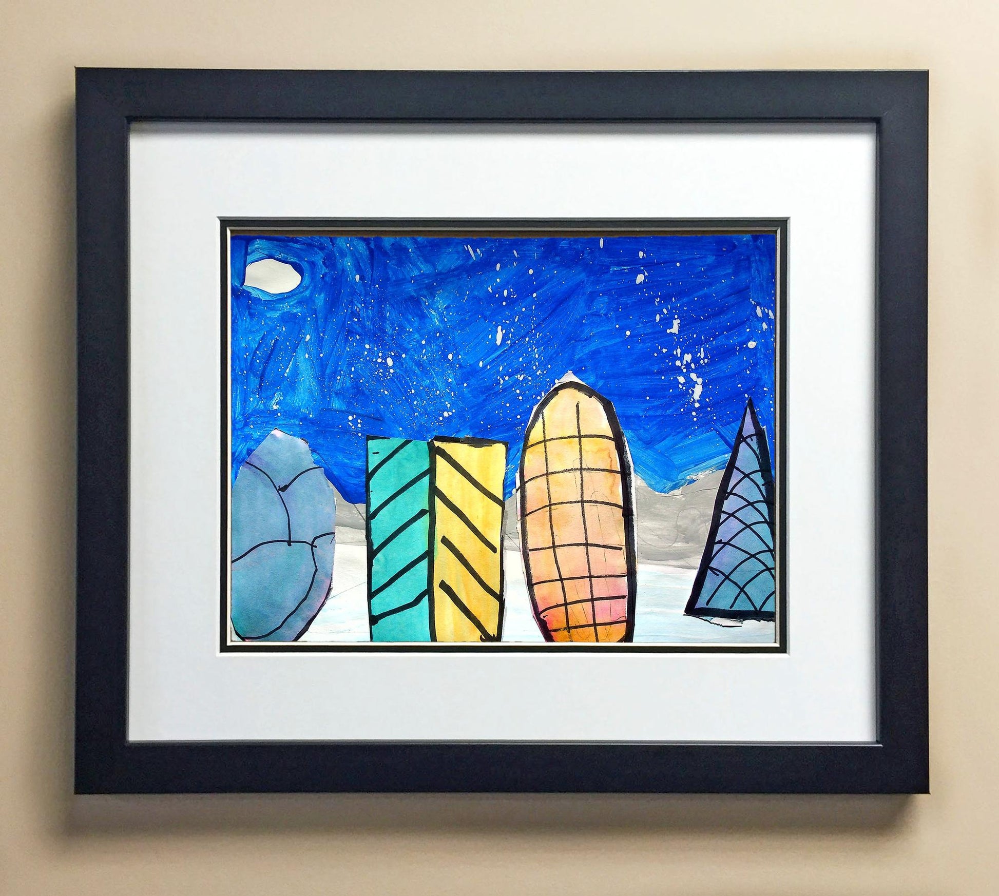Included with the purchase is the Students Artwork, Frame, double matboard, shatter proof plexiglass, and a ready to hang backerboard with turnbuttons