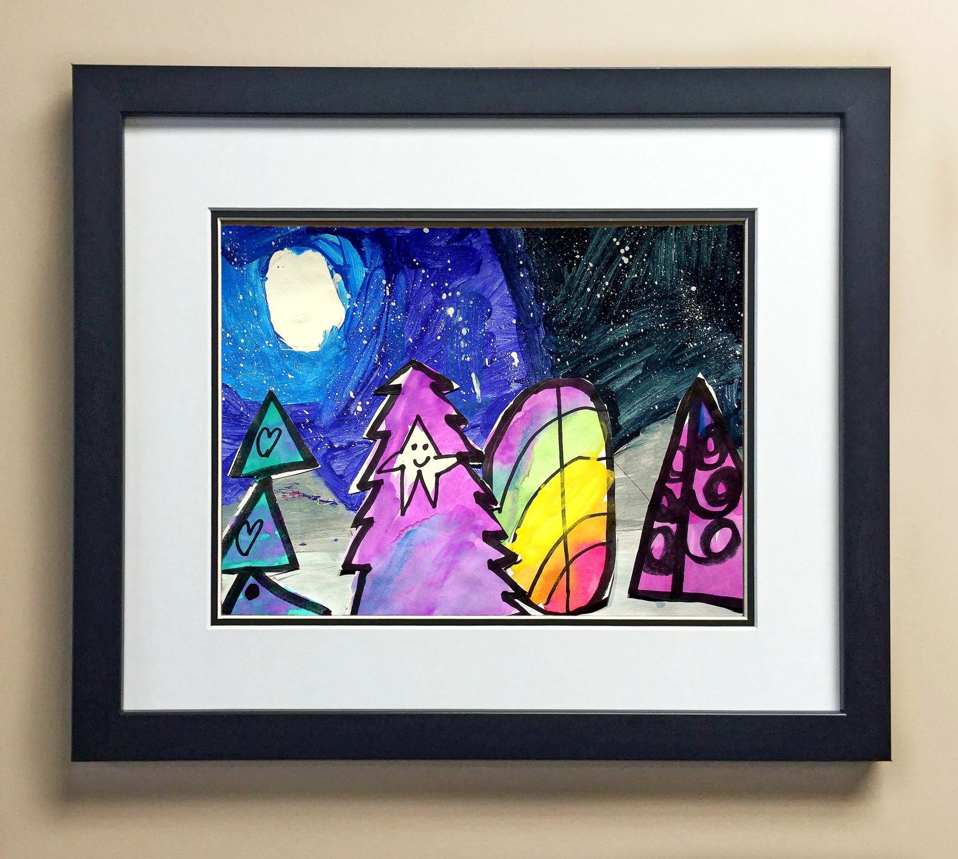 Included with the purchase is the Students Artwork, Frame, double matboard, shatter proof plexiglass, and a ready to hang backerboard with turnbuttons