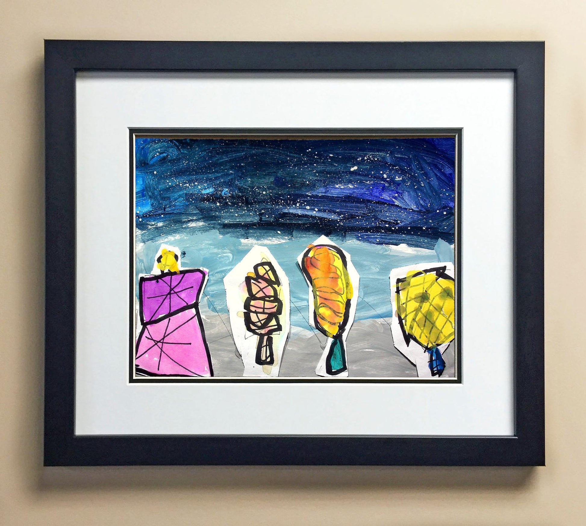 Included with the purchase is the Students Artwork, Frame, double matboard, shatter proof plexiglass, and a ready to hang backerboard with turnbuttons