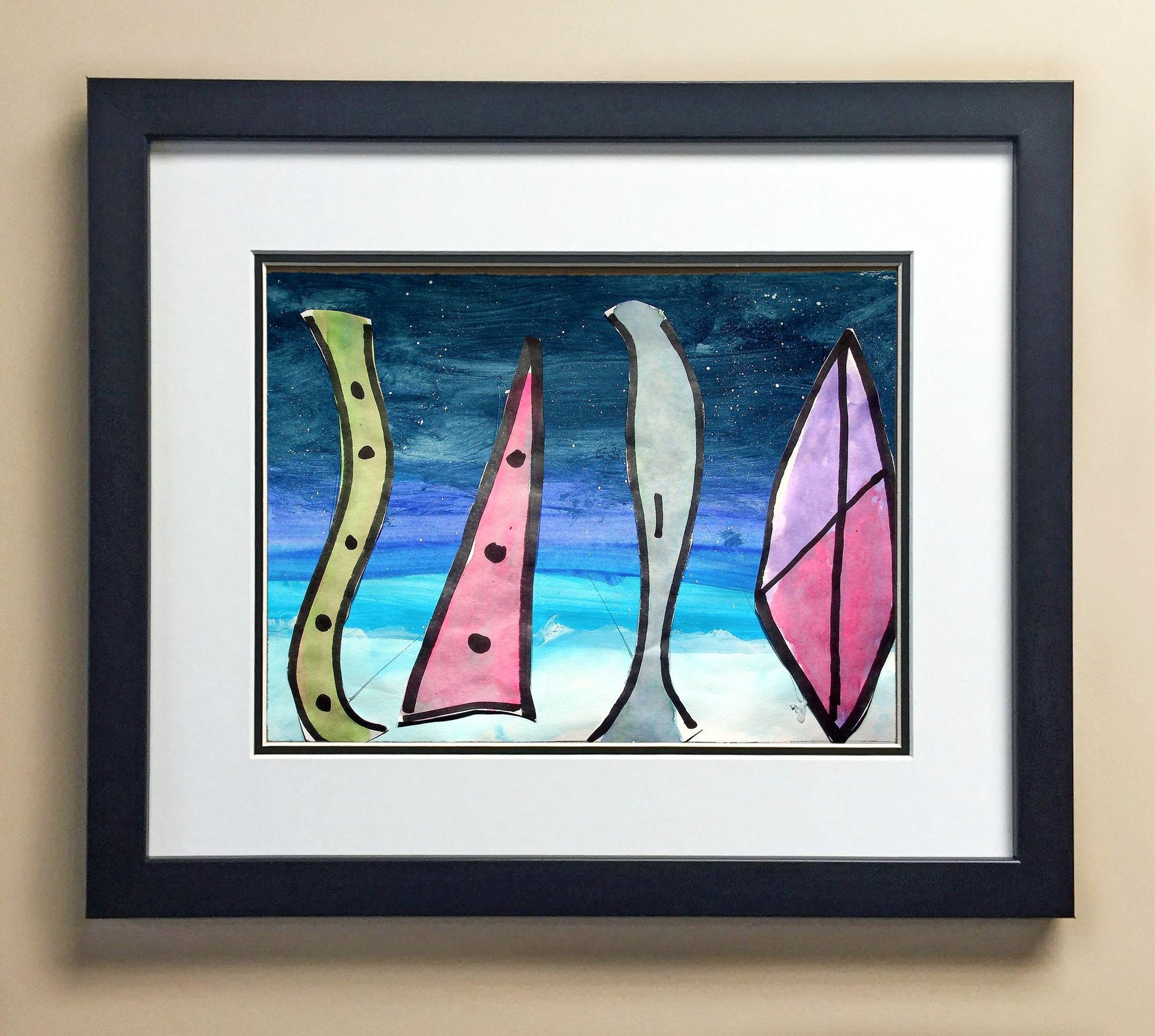 Included with the purchase is the Students Artwork, Frame, double matboard, shatter proof plexiglass, and a ready to hang backerboard with turnbuttons