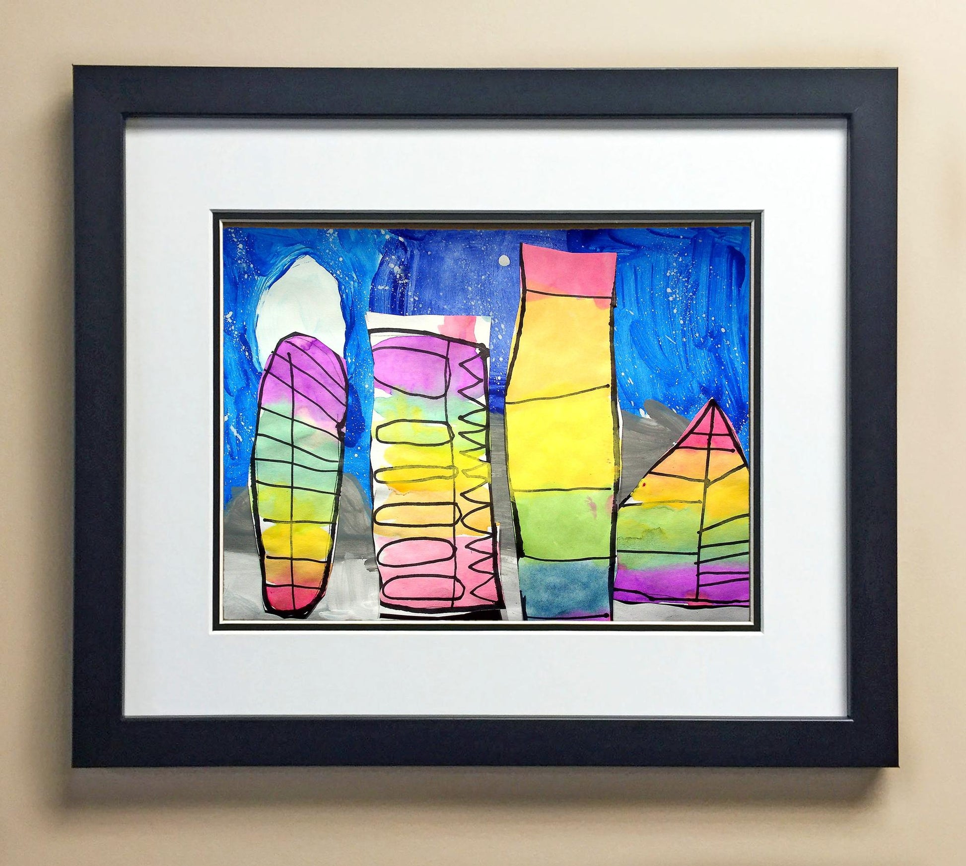 Included with the purchase is the Students Artwork, Frame, double matboard, shatter proof plexiglass, and a ready to hang backerboard with turnbuttons