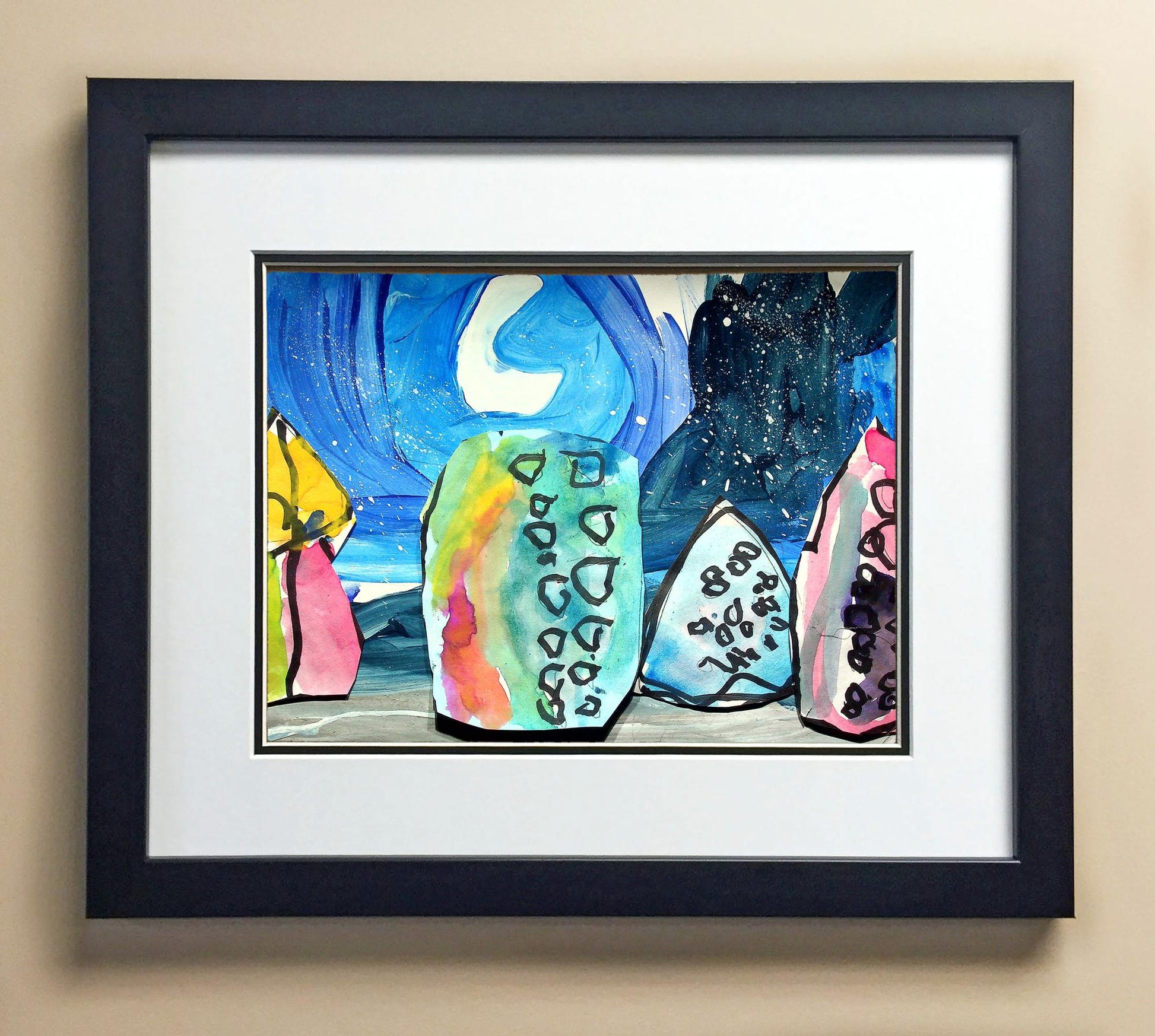 Included with the purchase is the Students Artwork, Frame, double matboard, shatter proof plexiglass, and a ready to hang backerboard with turnbuttons