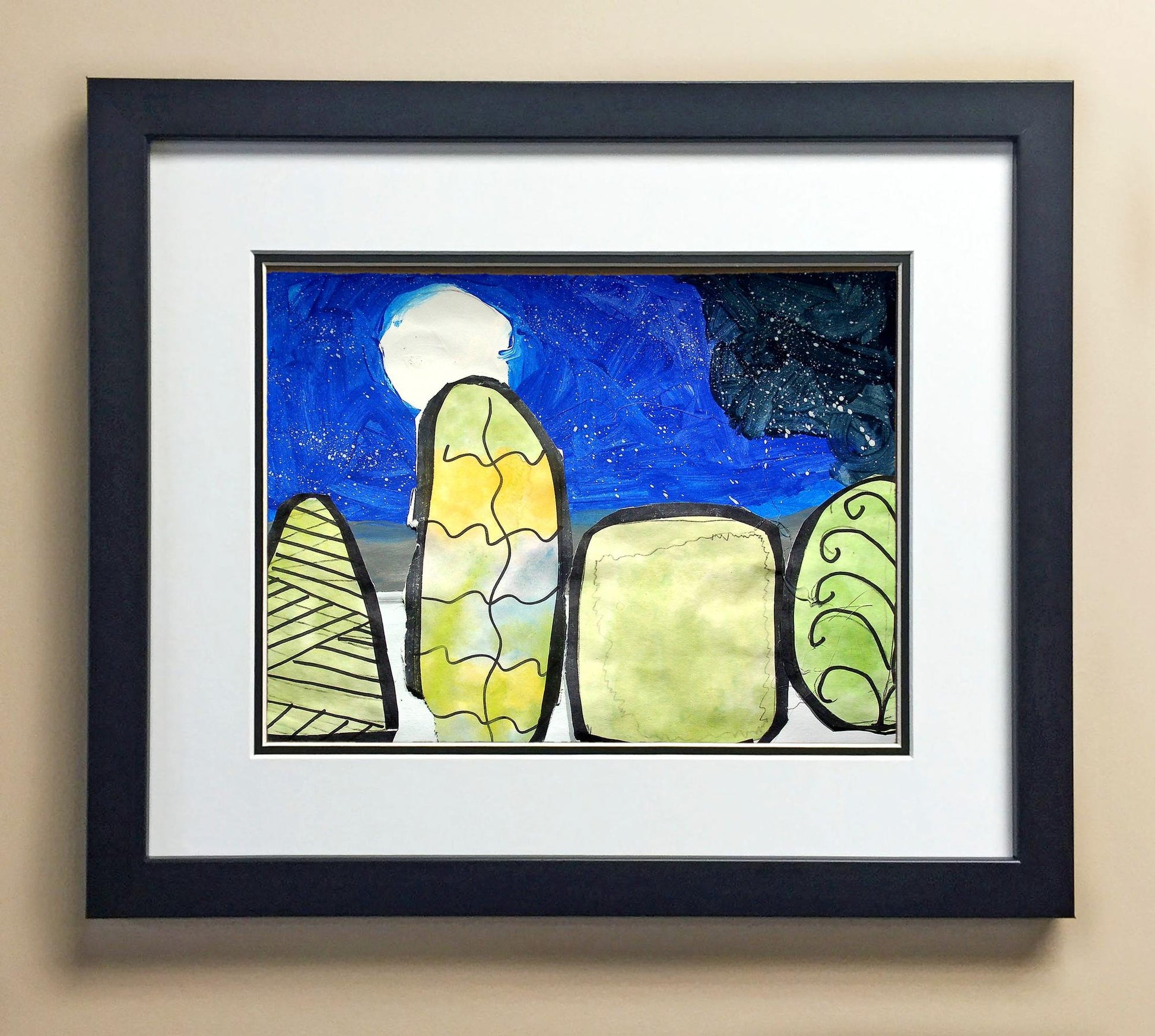 Included with the purchase is the Students Artwork, Frame, double matboard, shatter proof plexiglass, and a ready to hang backerboard with turnbuttons