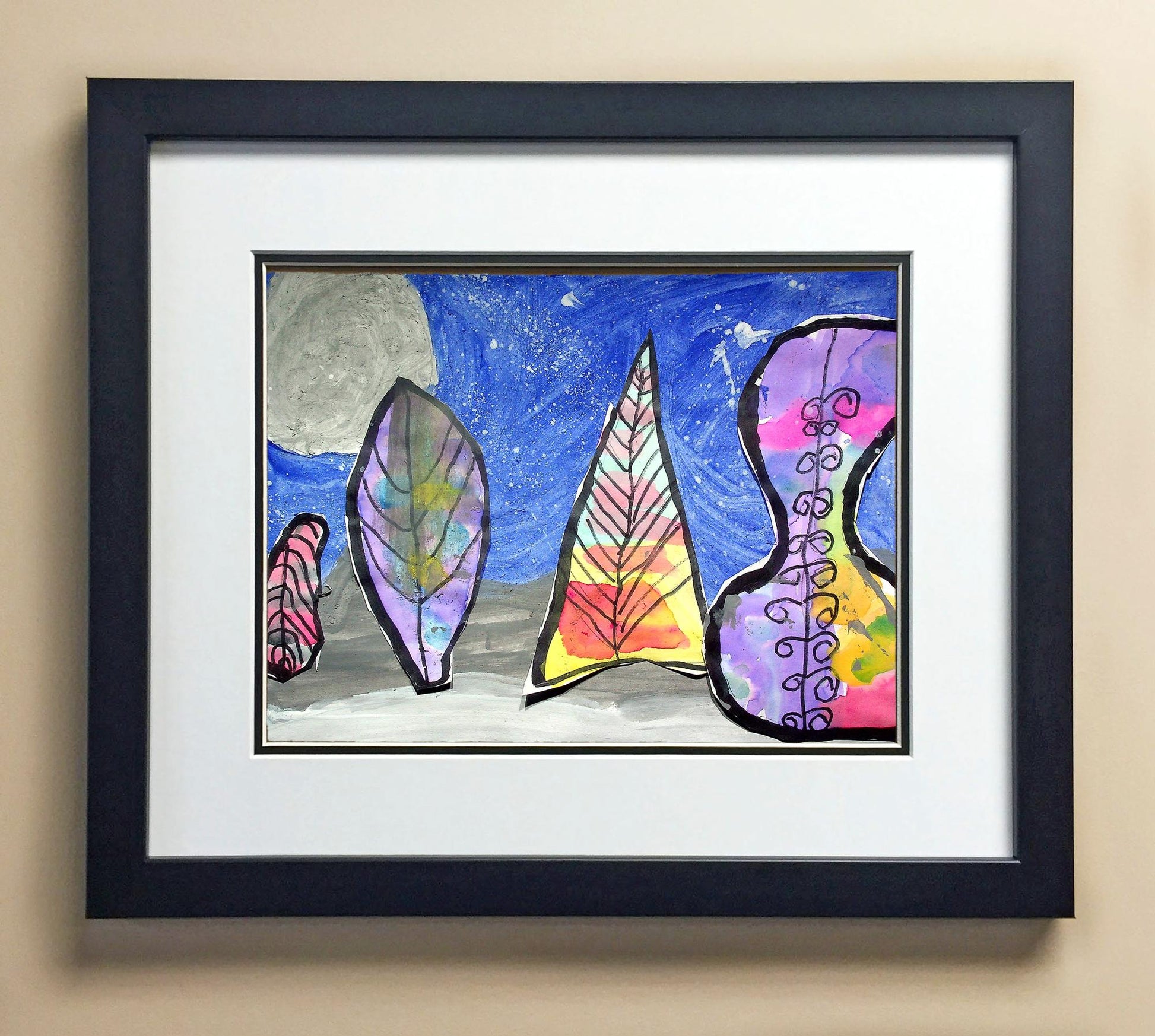 Included with the purchase is the Students Artwork, Frame, double matboard, shatter proof plexiglass, and a ready to hang backerboard with turnbuttons