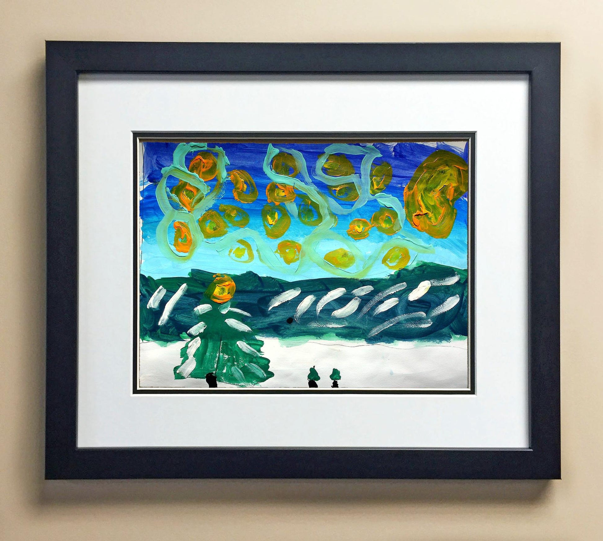 Included with the purchase is the Students Artwork, Frame, double matboard, shatter proof plexiglass, and a ready to hang backerboard with turnbuttons