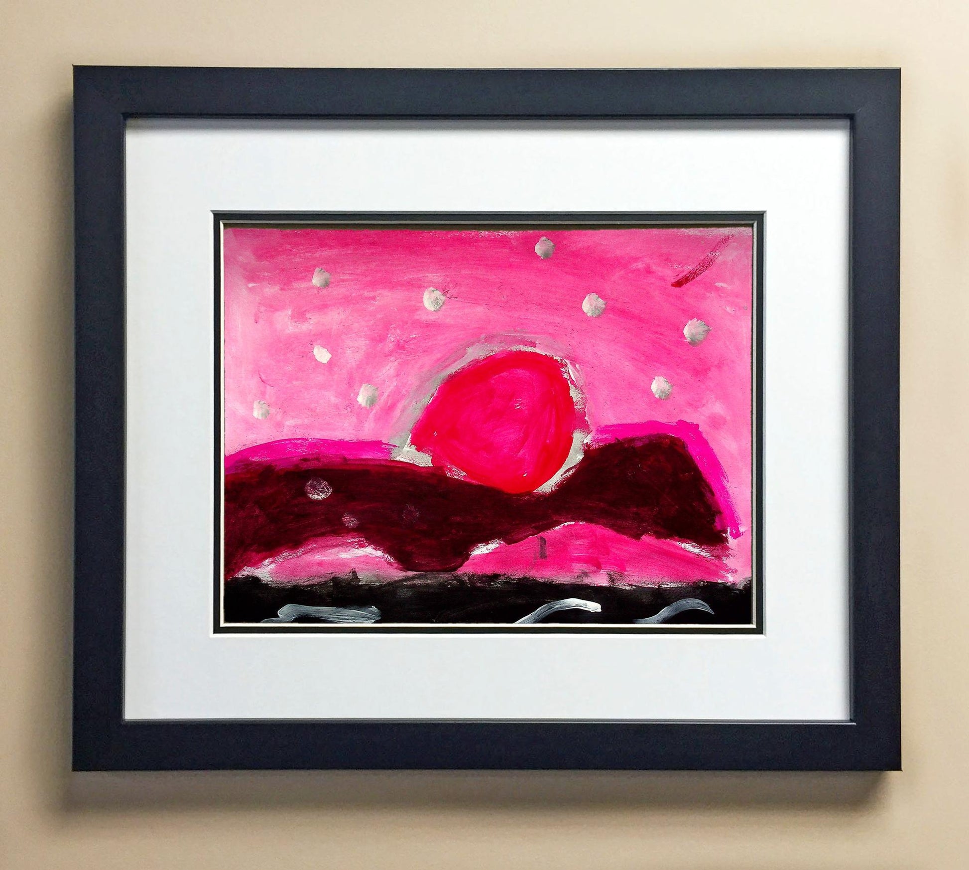 Included with the purchase is the Students Artwork, Frame, double matboard, shatter proof plexiglass, and a ready to hang backerboard with turnbuttons