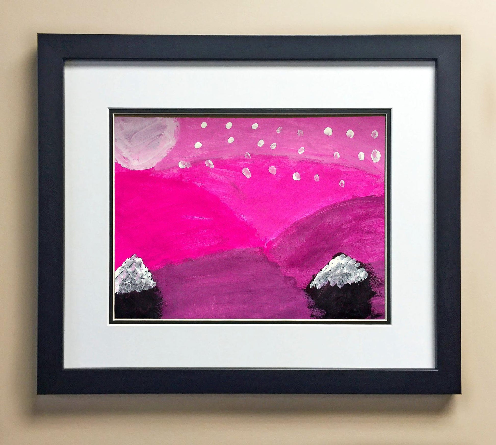 Included with the purchase is the Students Artwork, Frame, double matboard, shatter proof plexiglass, and a ready to hang backerboard with turnbuttons
