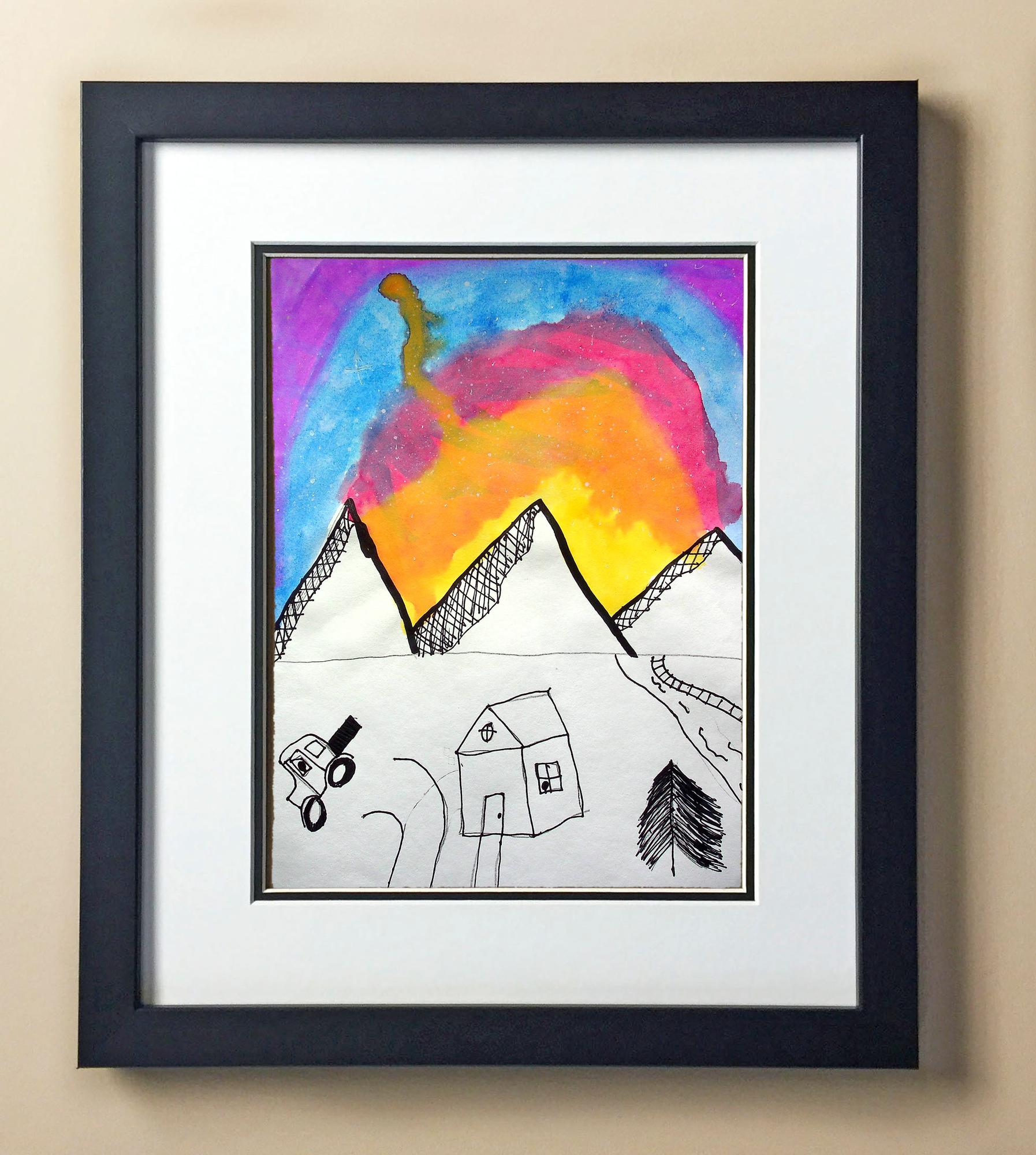Included with the purchase is the Students Artwork, Frame, double matboard, shatter proof plexiglass, and a ready to hang backerboard with turnbuttons