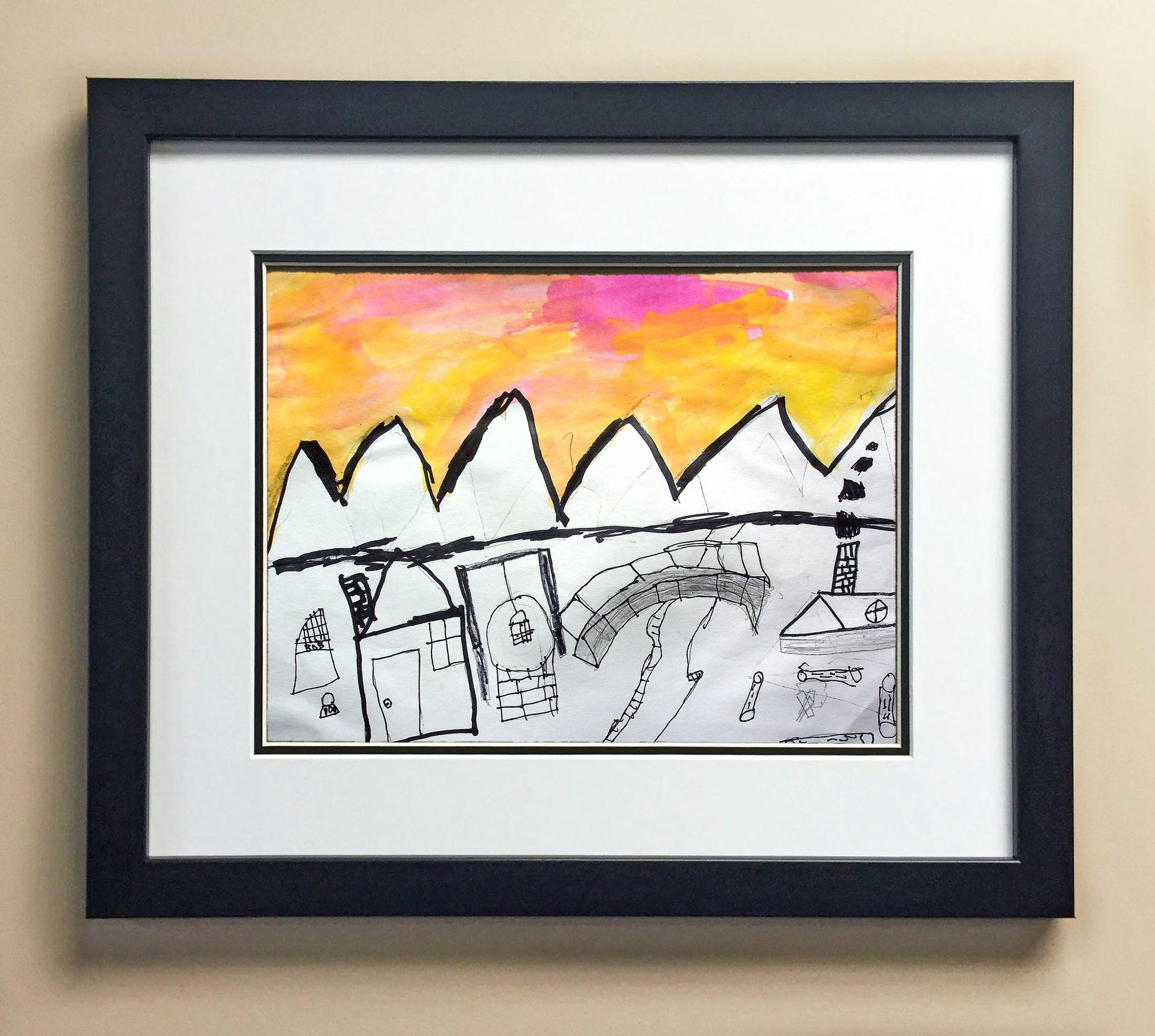 Included with the purchase is the Students Artwork, Frame, double matboard, shatter proof plexiglass, and a ready to hang backerboard with turnbuttons