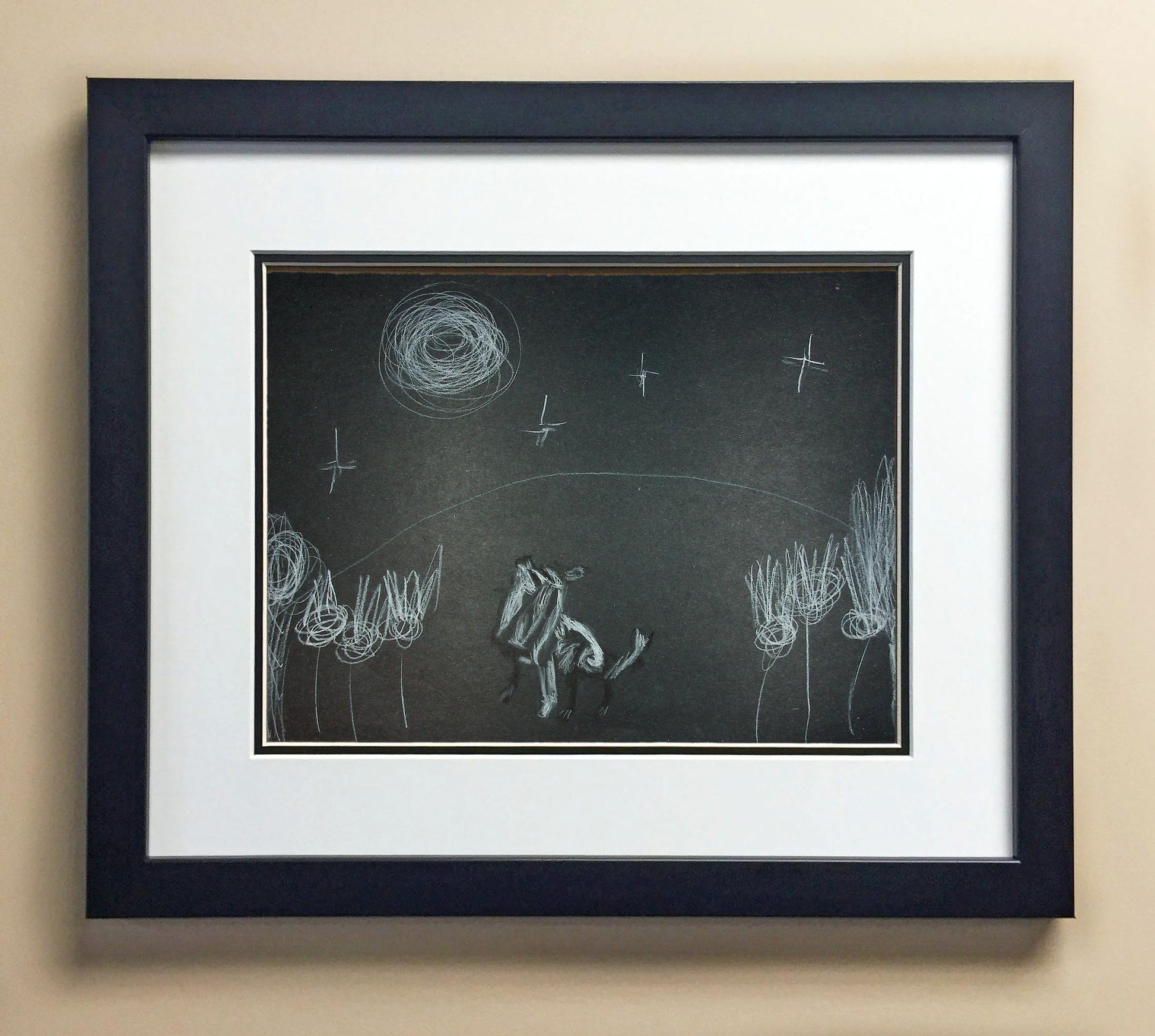 Included with the purchase is the Students Artwork, Frame, double matboard, shatter proof plexiglass, and a ready to hang backerboard with turnbuttons