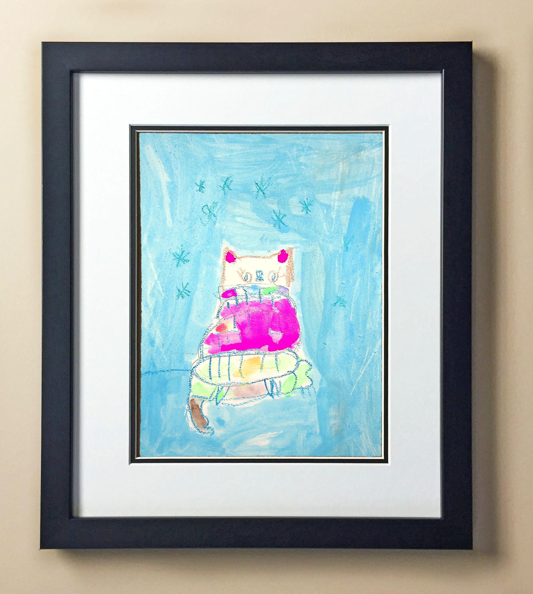 Included with the purchase is the Students Artwork, Frame, double matboard, shatter proof plexiglass, and a ready to hang backerboard with turnbuttons