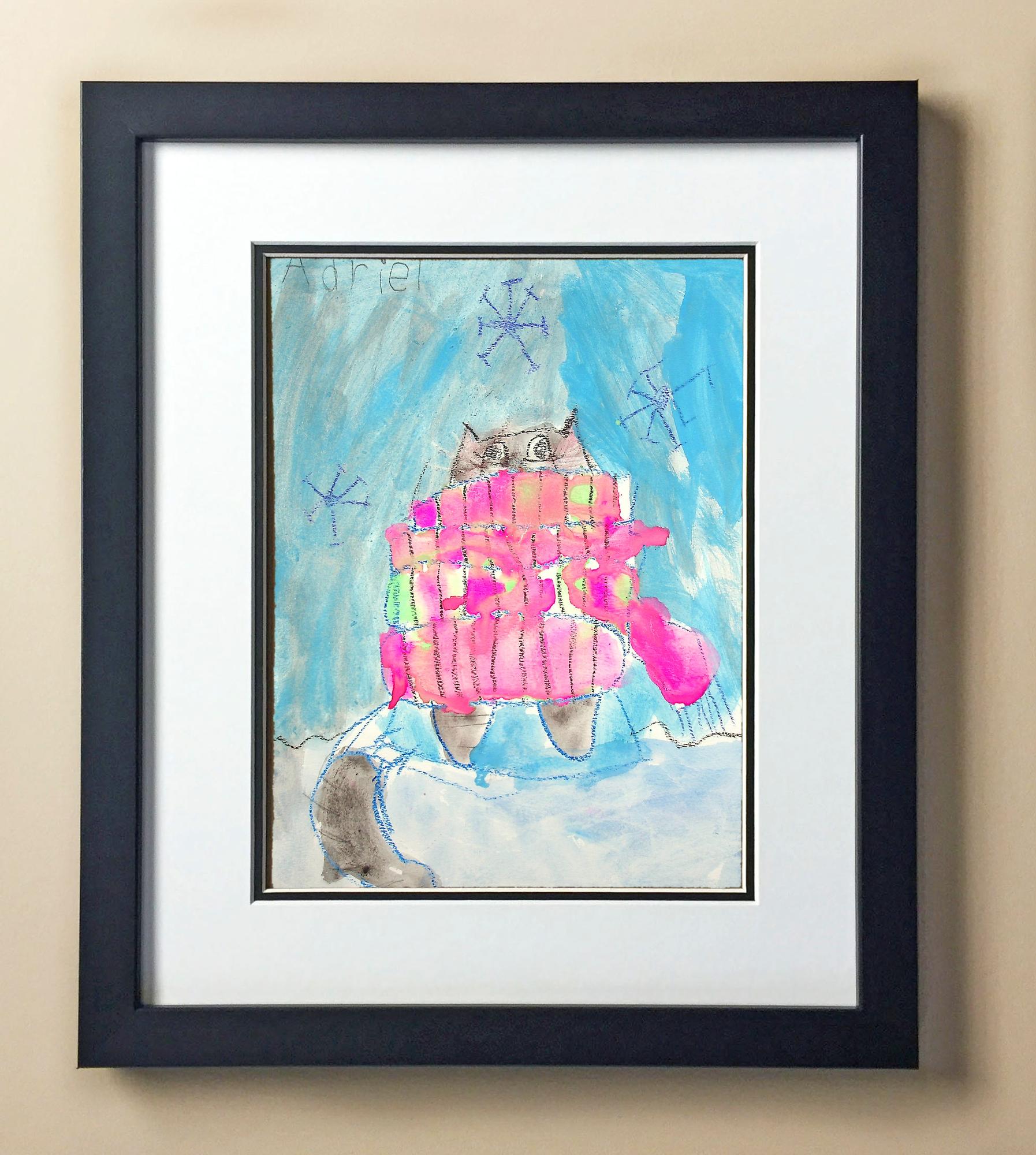 Included with the purchase is the Students Artwork, Frame, double matboard, shatter proof plexiglass, and a ready to hang backerboard with turnbuttons