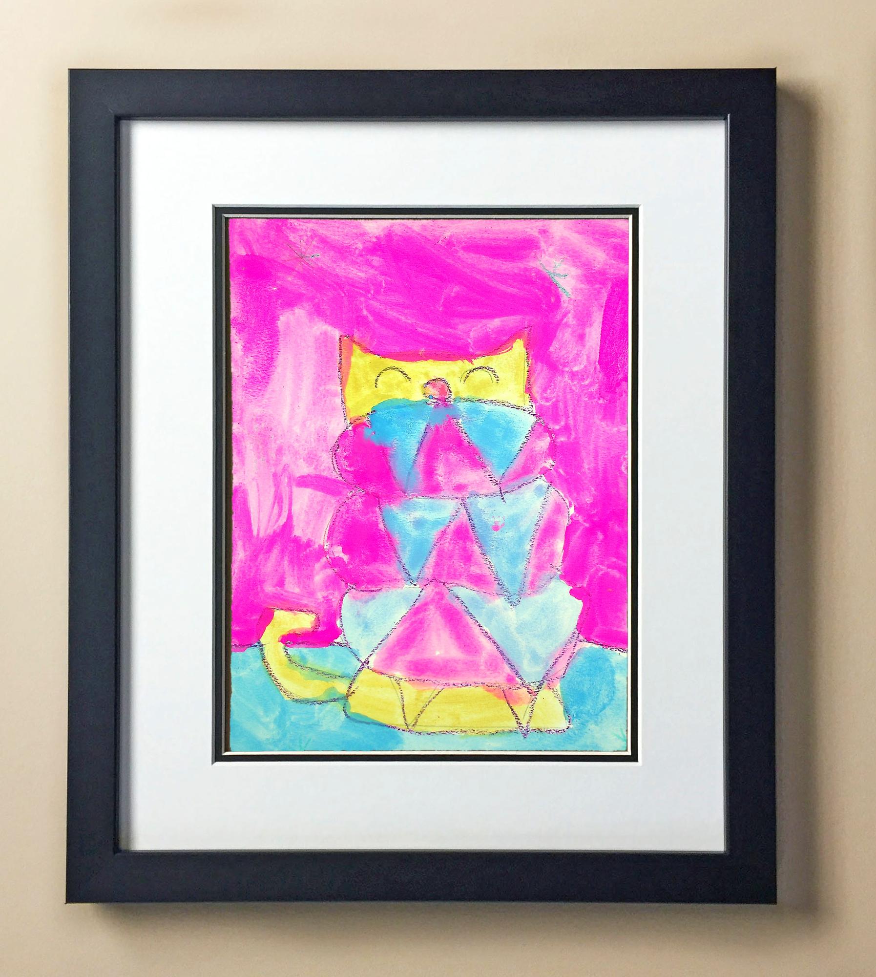 Included with the purchase is the Students Artwork, Frame, double matboard, shatter proof plexiglass, and a ready to hang backerboard with turnbuttons