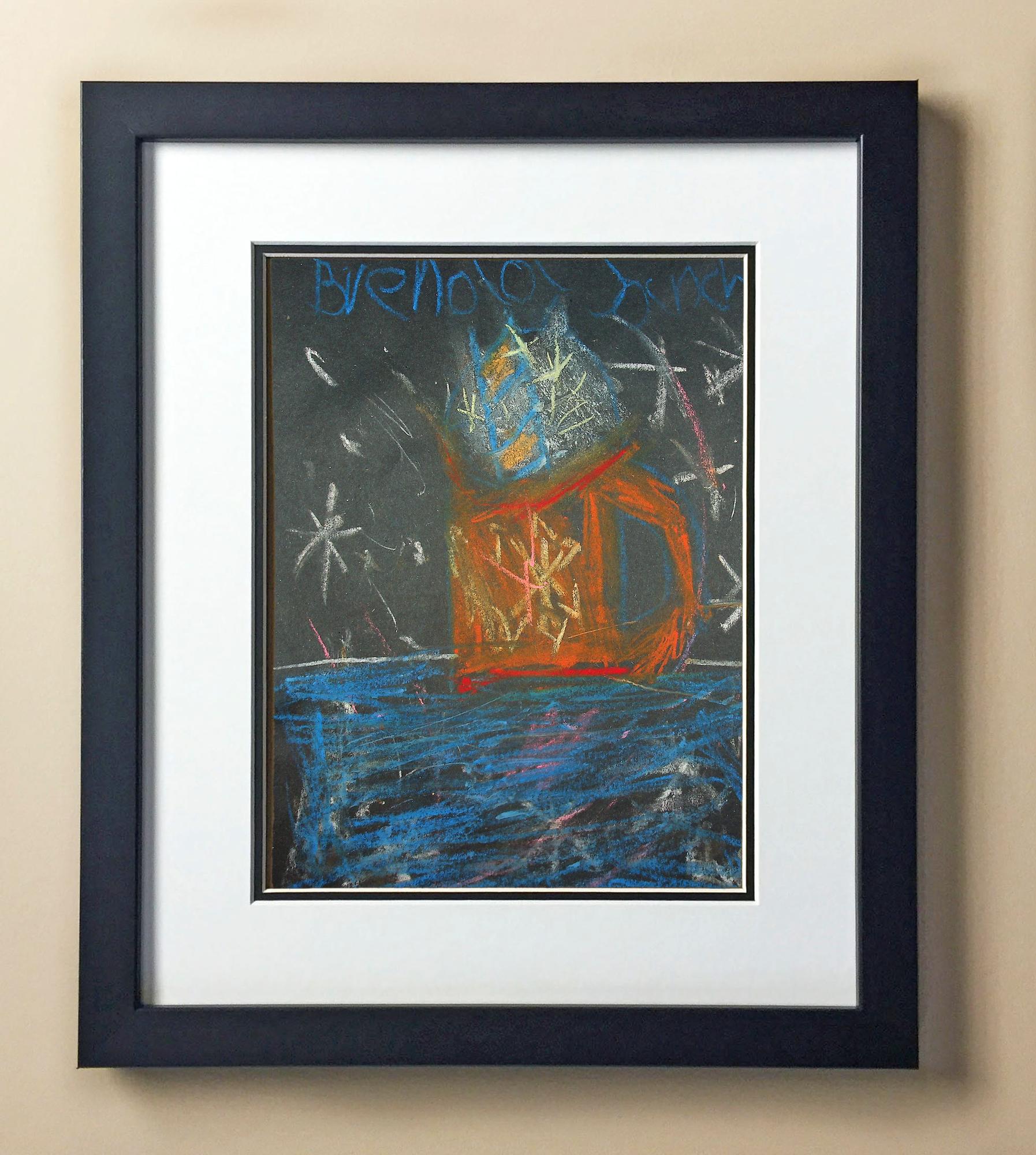 Included with the purchase is the Students Artwork, Frame, double matboard, shatter proof plexiglass, and a ready to hang backerboard with turnbuttons