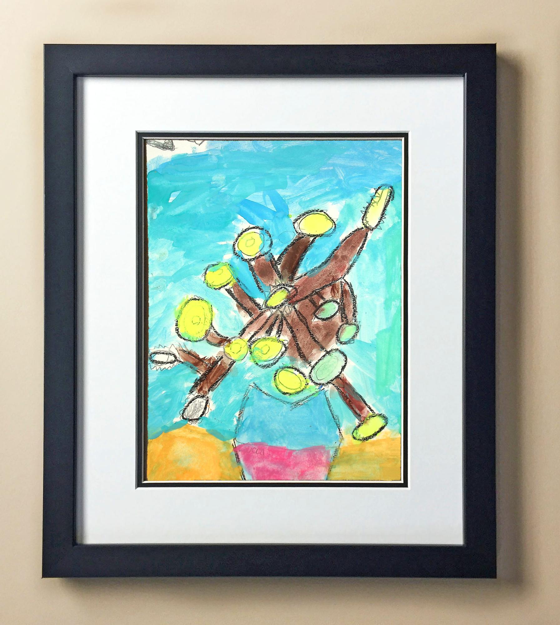 Included with the purchase is the Students Artwork, Frame, double matboard, shatter proof plexiglass, and a ready to hang backerboard with turnbuttons