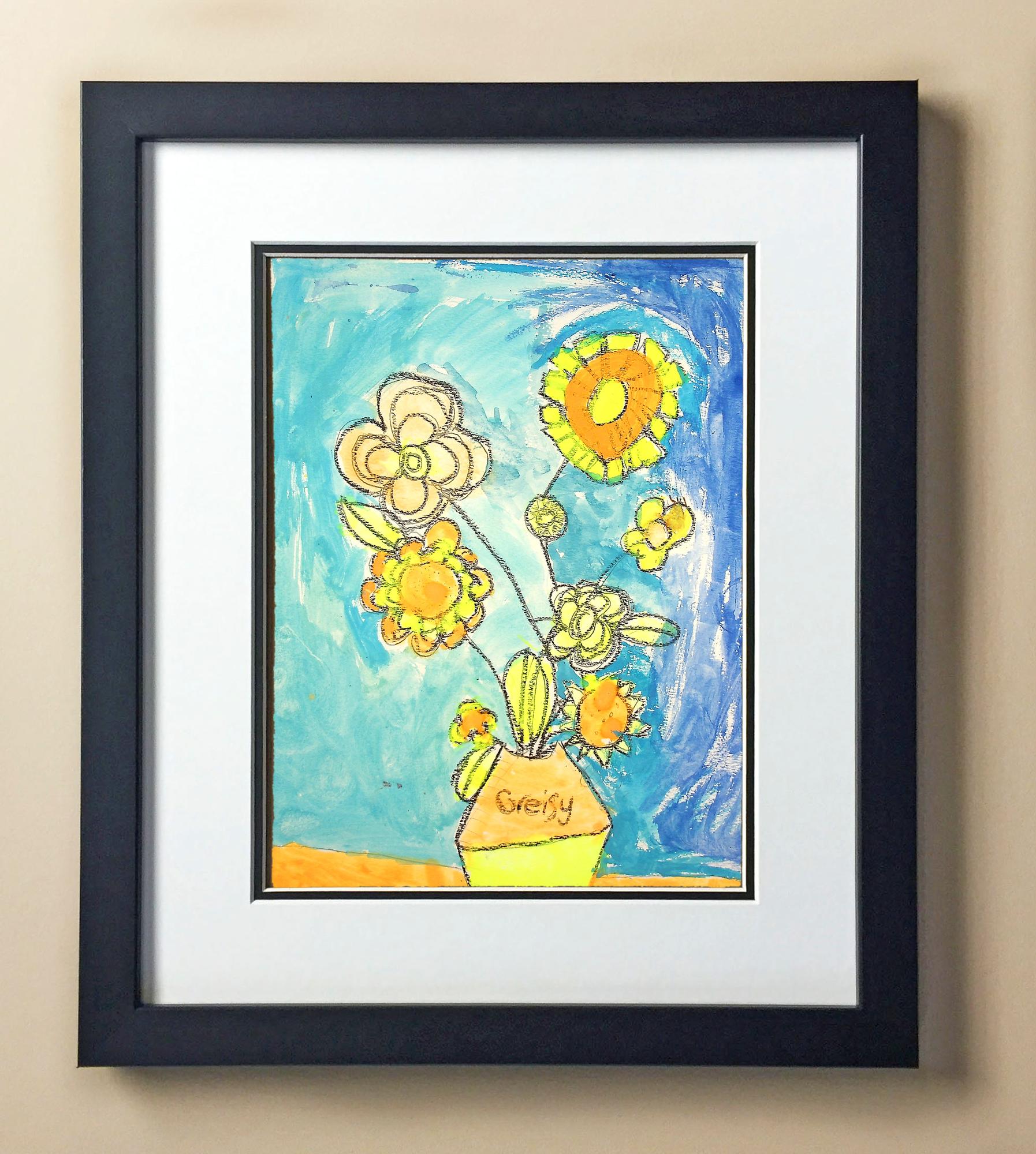 Included with the purchase is the Students Artwork, Frame, double matboard, shatter proof plexiglass, and a ready to hang backerboard with turnbuttons