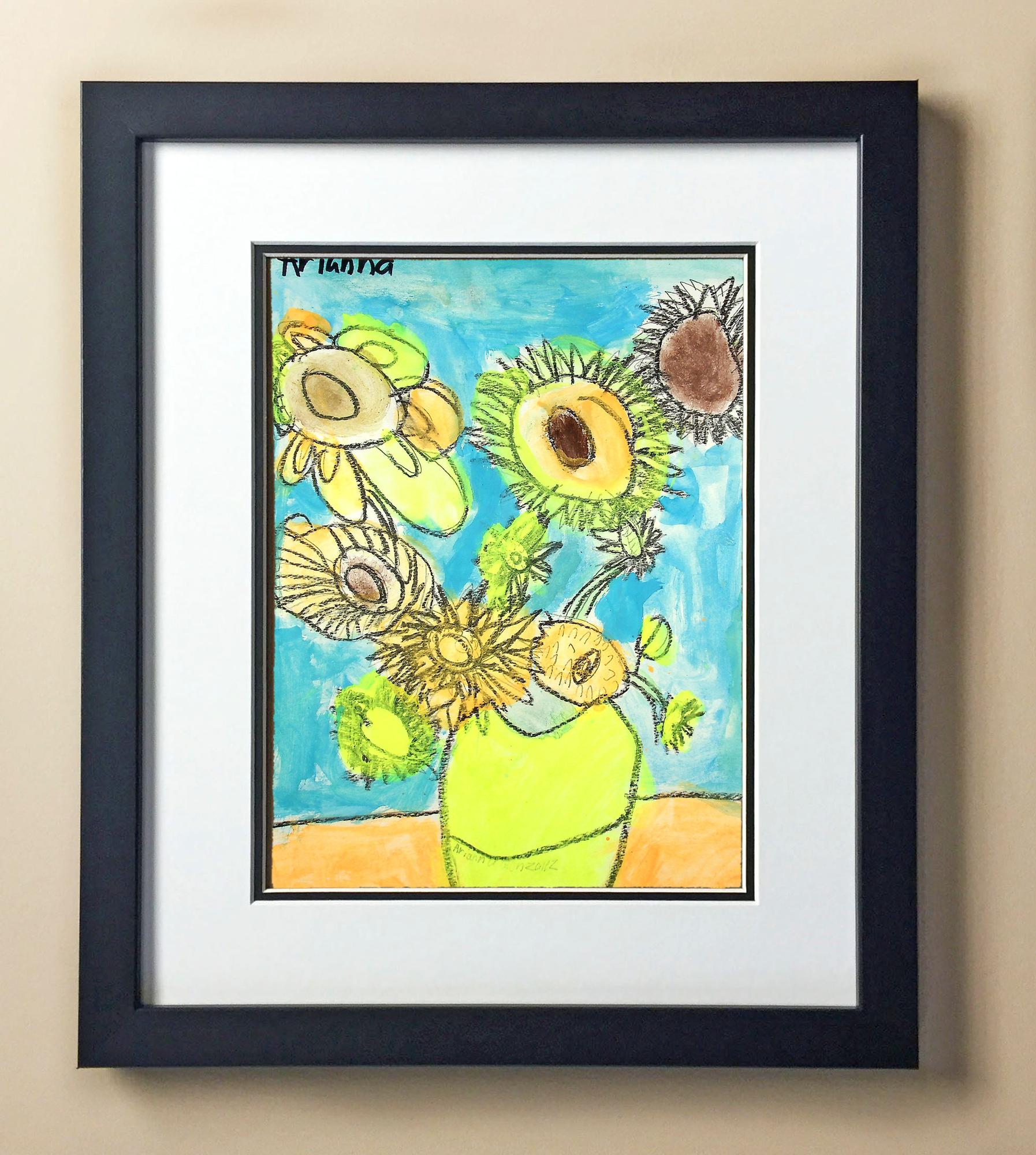 Included with the purchase is the Students Artwork, Frame, double matboard, shatter proof plexiglass, and a ready to hang backerboard with turnbuttons