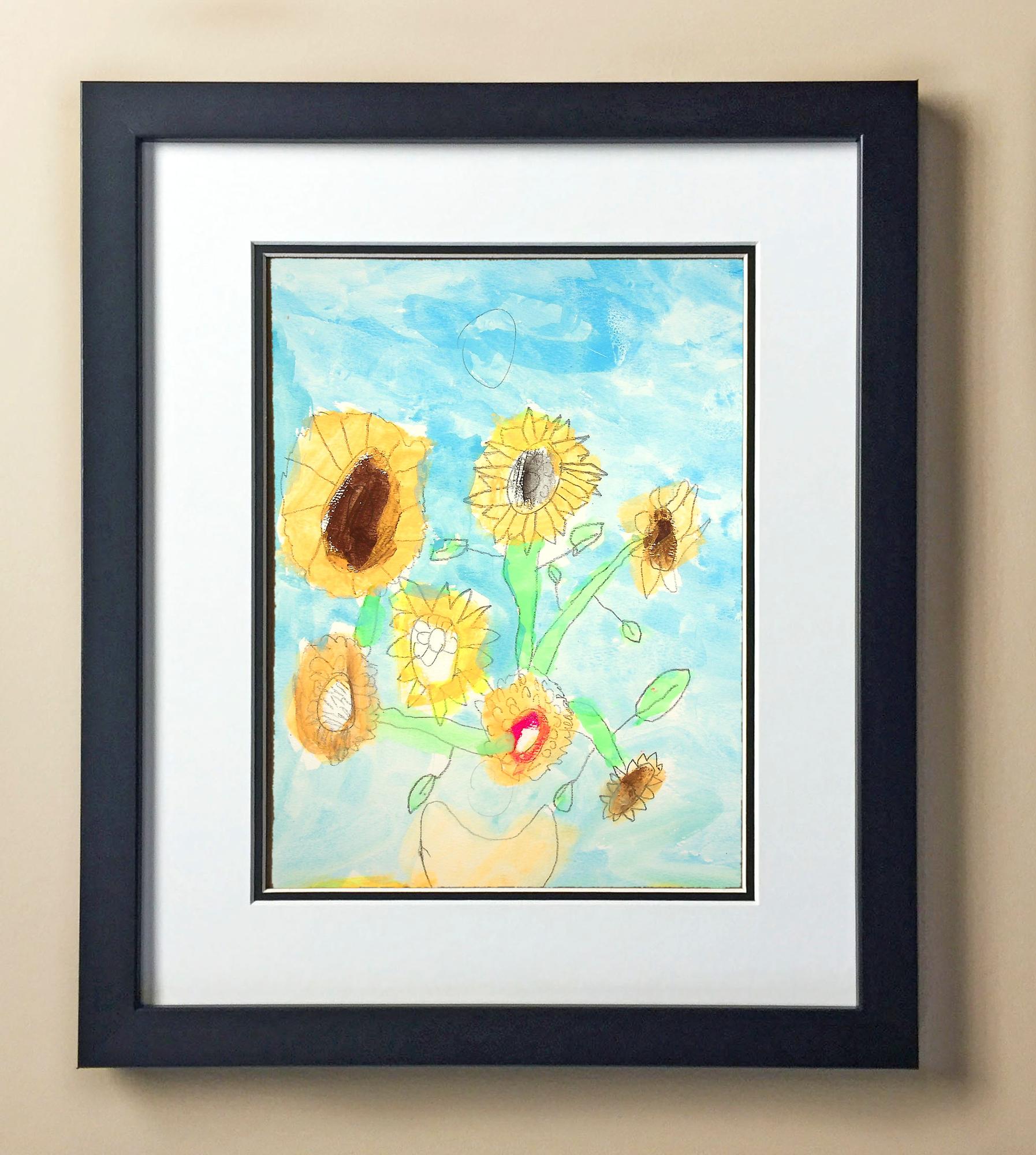 Included with the purchase is the Students Artwork, Frame, double matboard, shatter proof plexiglass, and a ready to hang backerboard with turnbuttons