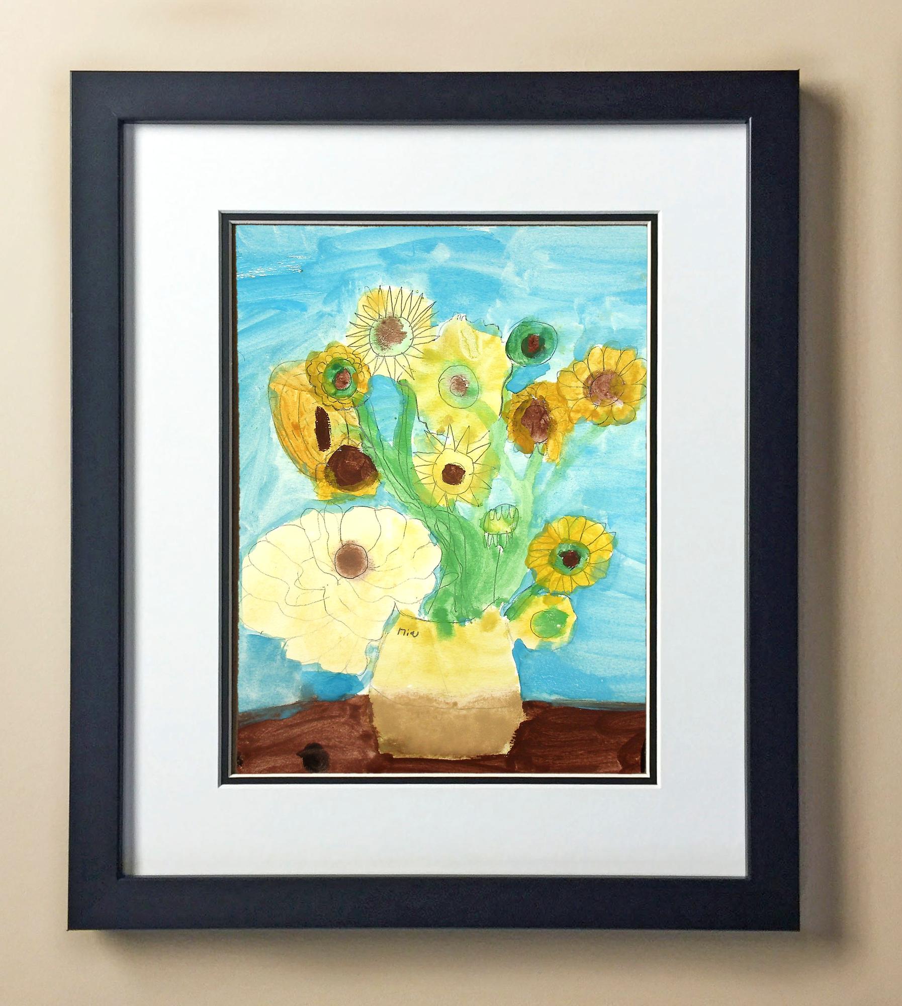 Included with the purchase is the Students Artwork, Frame, double matboard, shatter proof plexiglass, and a ready to hang backerboard with turnbuttons