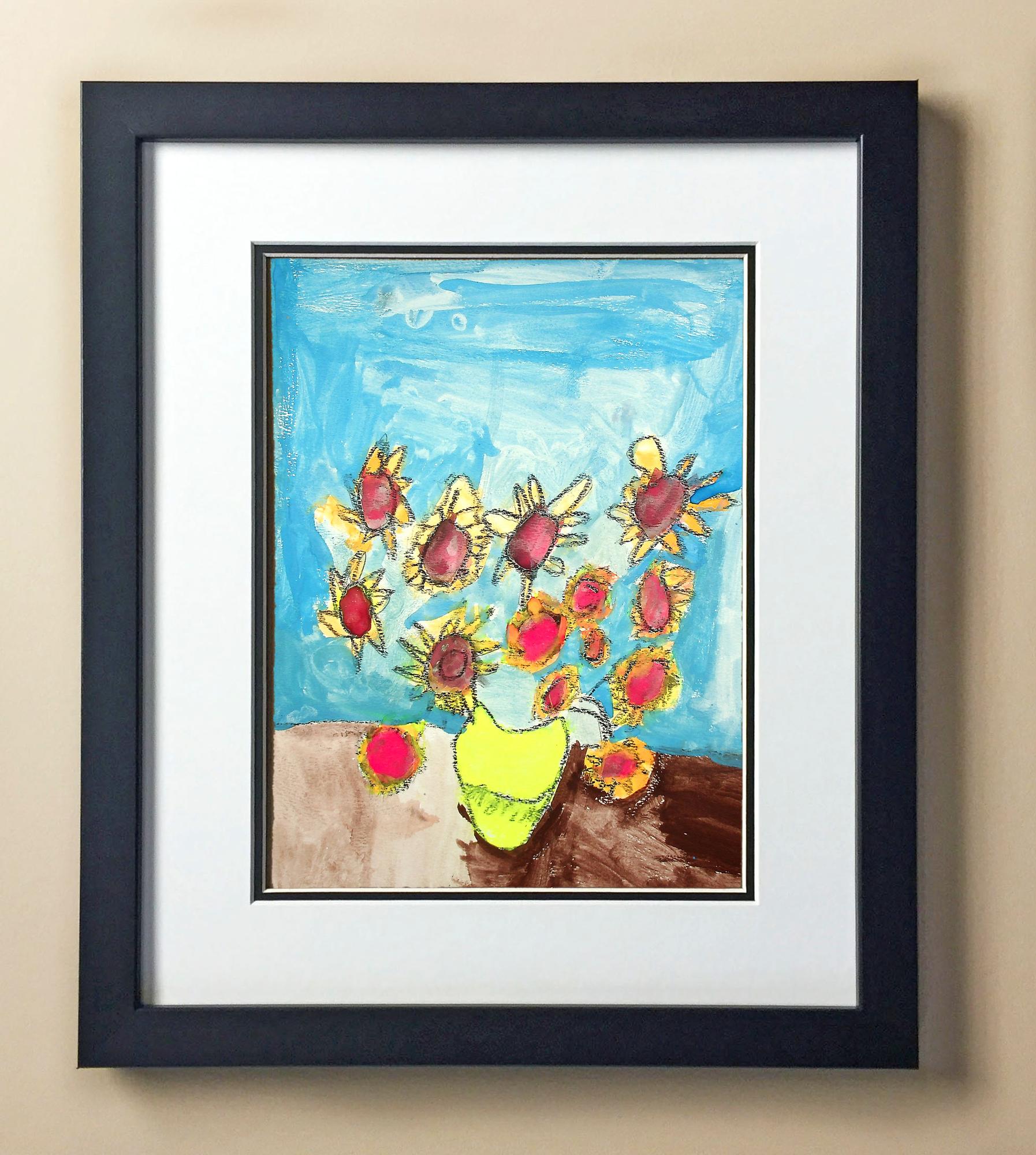 Included with the purchase is the Students Artwork, Frame, double matboard, shatter proof plexiglass, and a ready to hang backerboard with turnbuttons