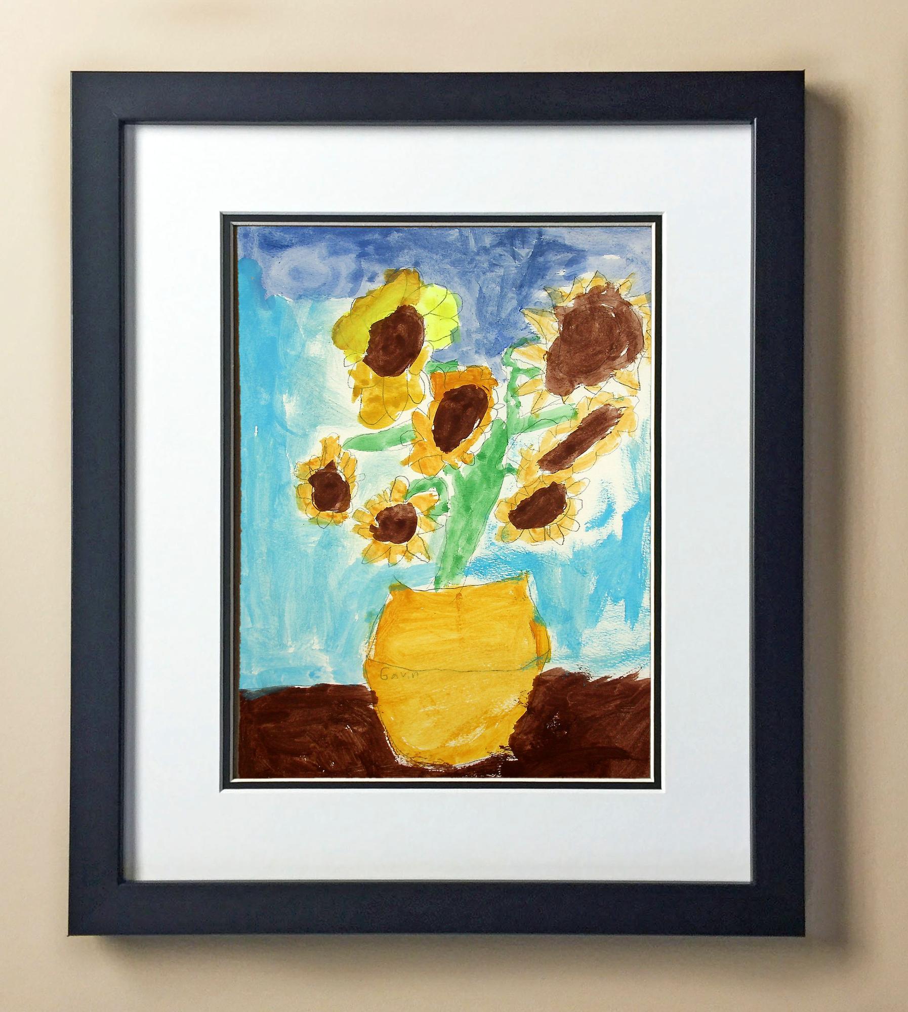 Included with the purchase is the Students Artwork, Frame, double matboard, shatter proof plexiglass, and a ready to hang backerboard with turnbuttons