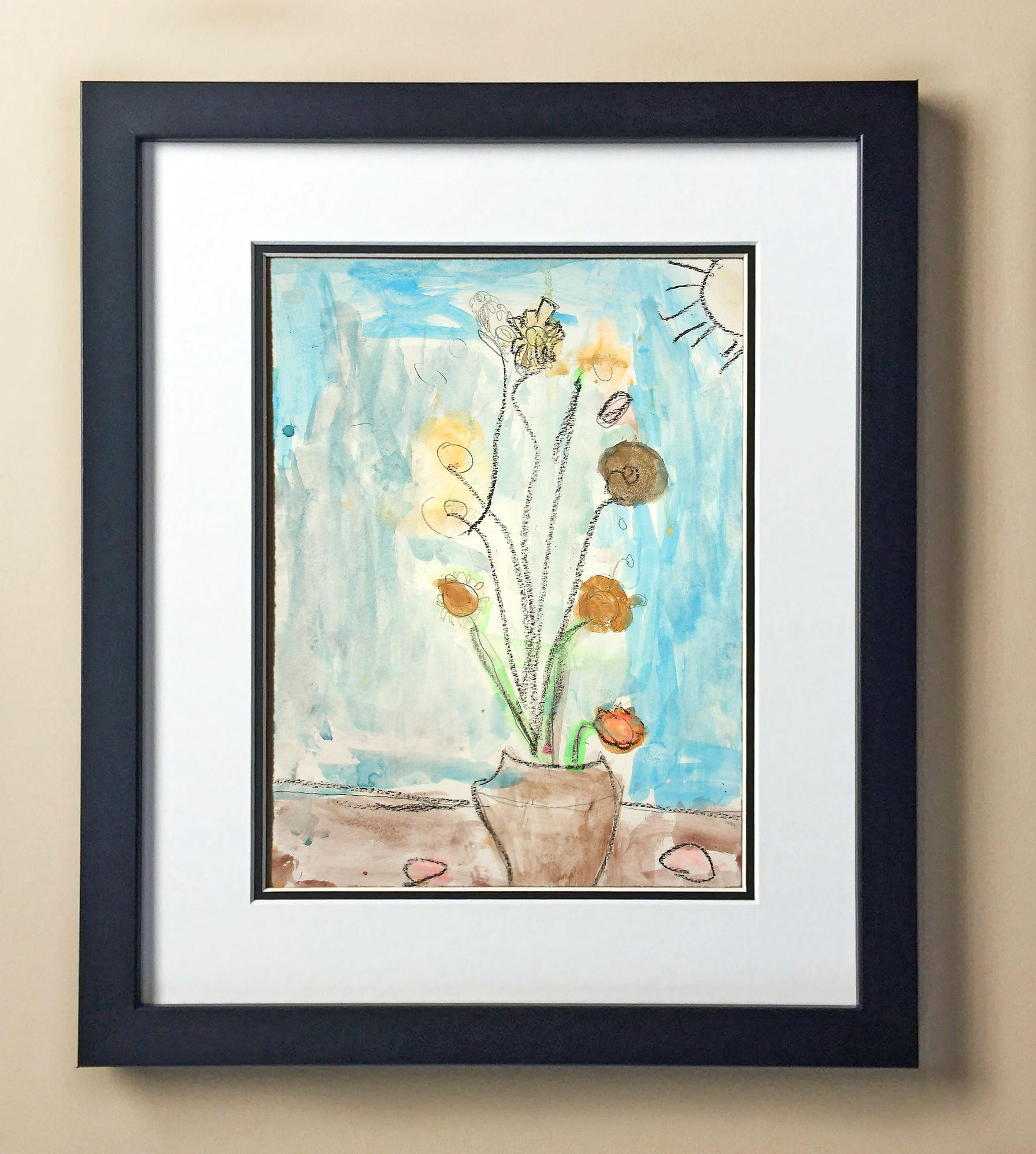 Included with the purchase is the Students Artwork, Frame, double matboard, shatter proof plexiglass, and a ready to hang backerboard with turnbuttons